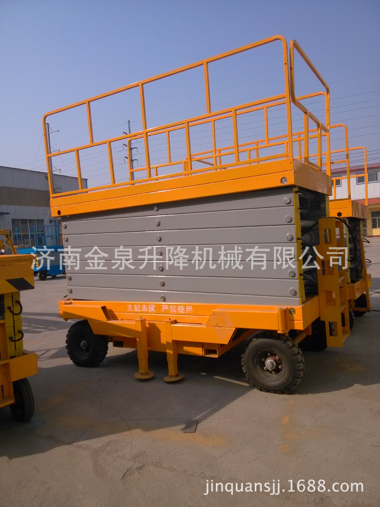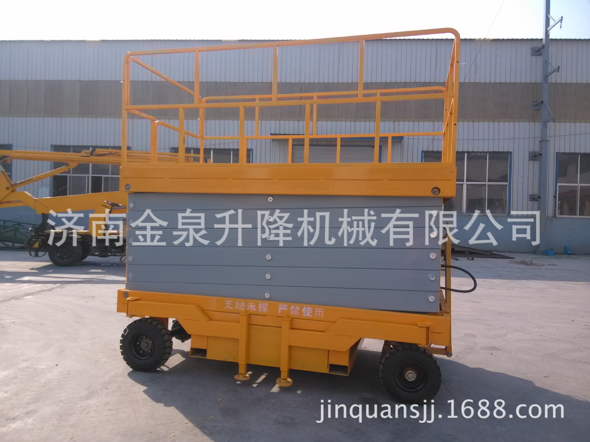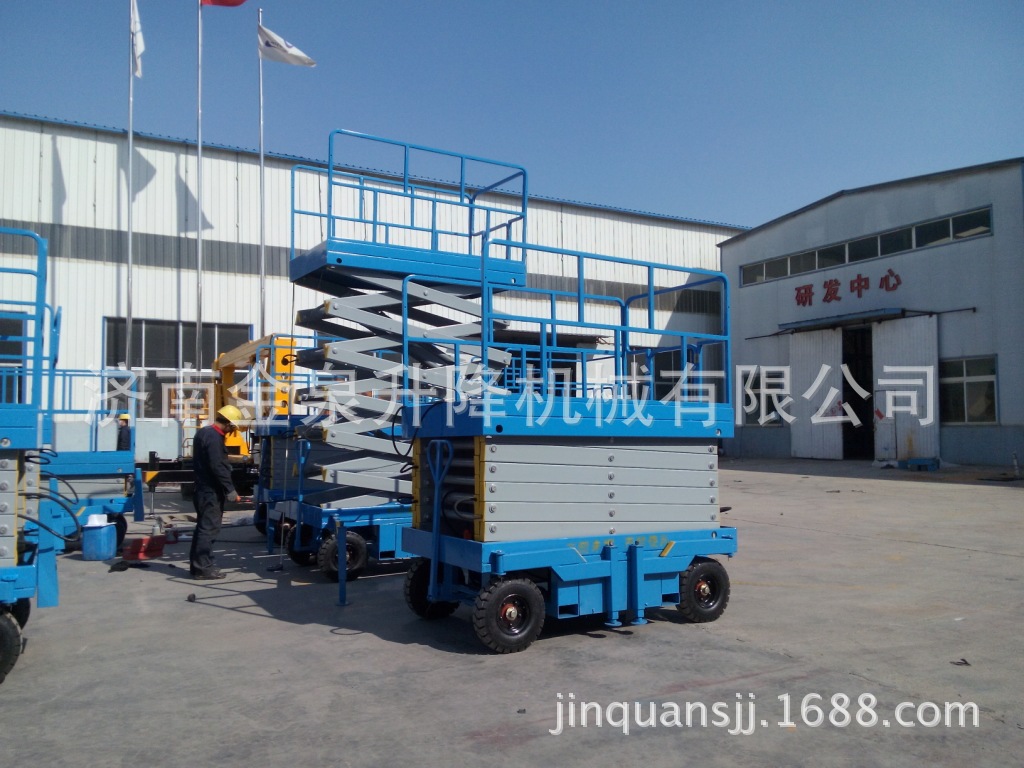 移动剪叉式升降机采用电动液压传动,升降支臂由优质矩形锰钢制作,强度高。升降机升起后,支臂呈剪刀状,又称剪叉式升降机。油缸采用斜撑方式,稳定性好。油缸为双层金属网加强型防爆油缸,能有效防止油缸突然爆裂。