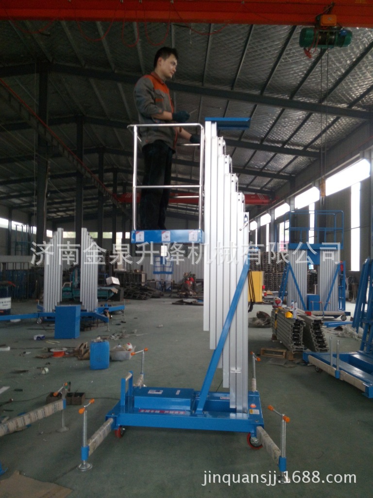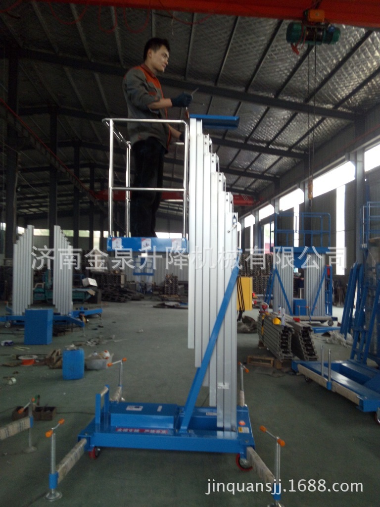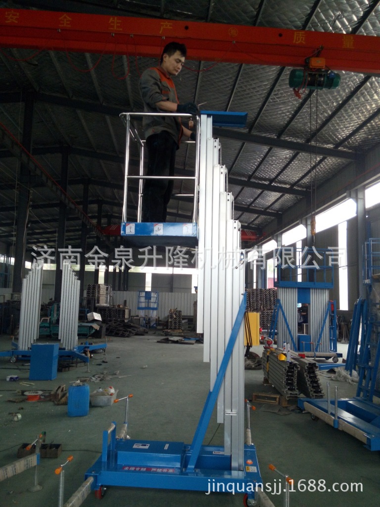 SJYL0.1-8移动式铝合金升降机:该系列平台采用了高强度铝合金型材精制而成,结构文雅小巧,整机重量极轻,推行及上下楼极为方便,
