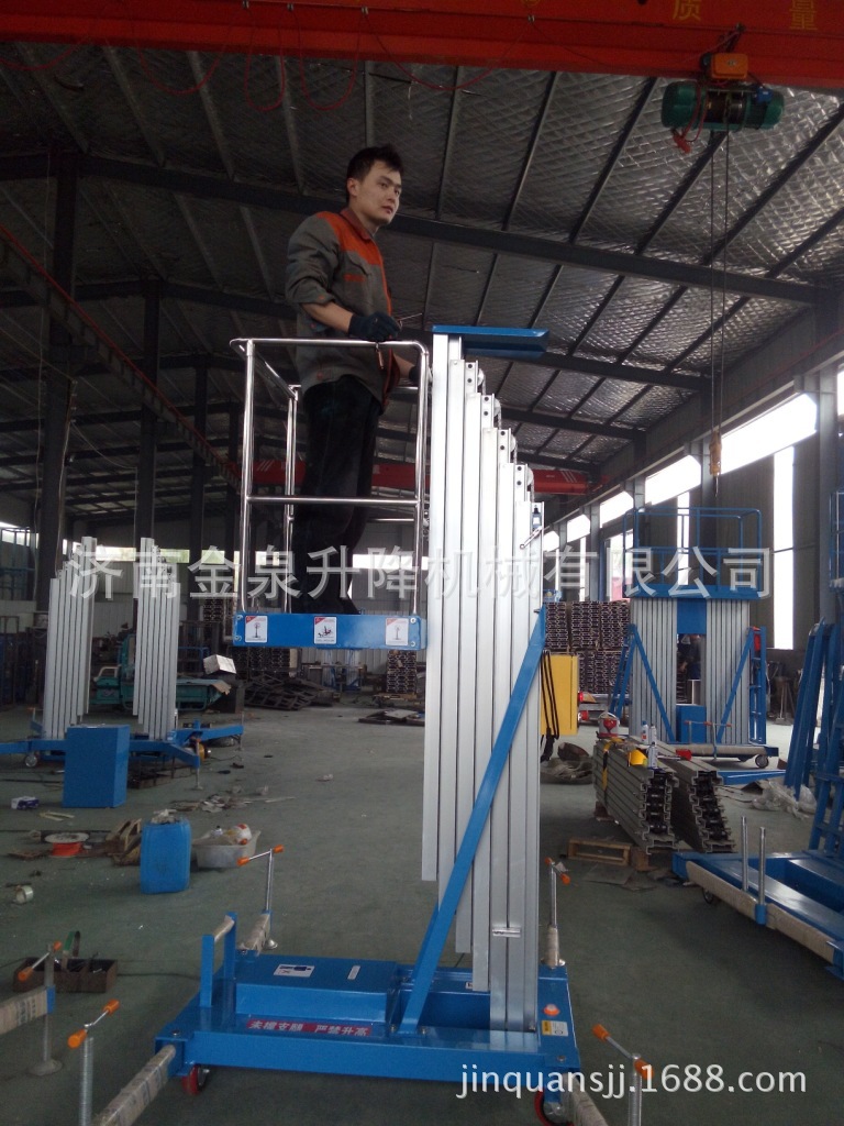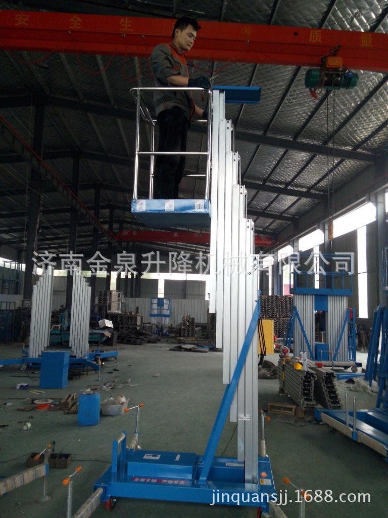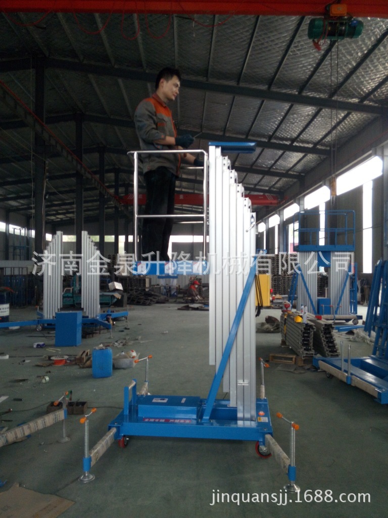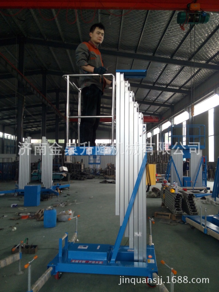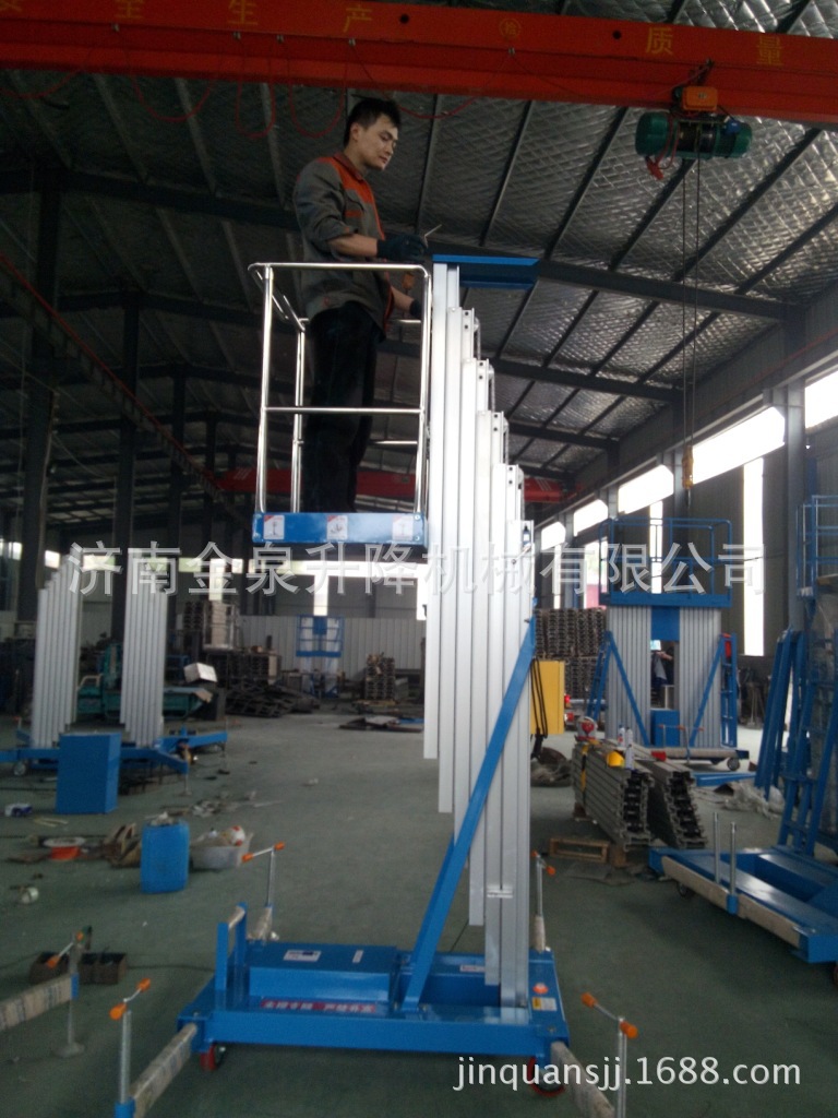 贴墙工作及探出作业,工作无死角。单立柱式铝合金电动升降机配上龙门
