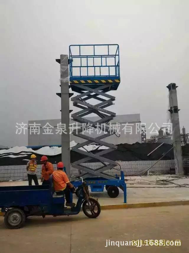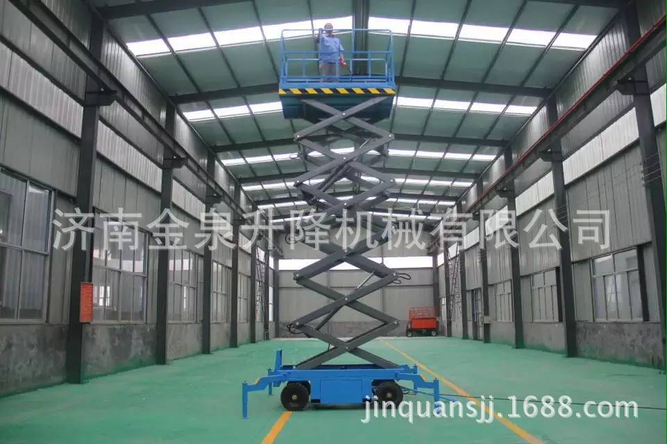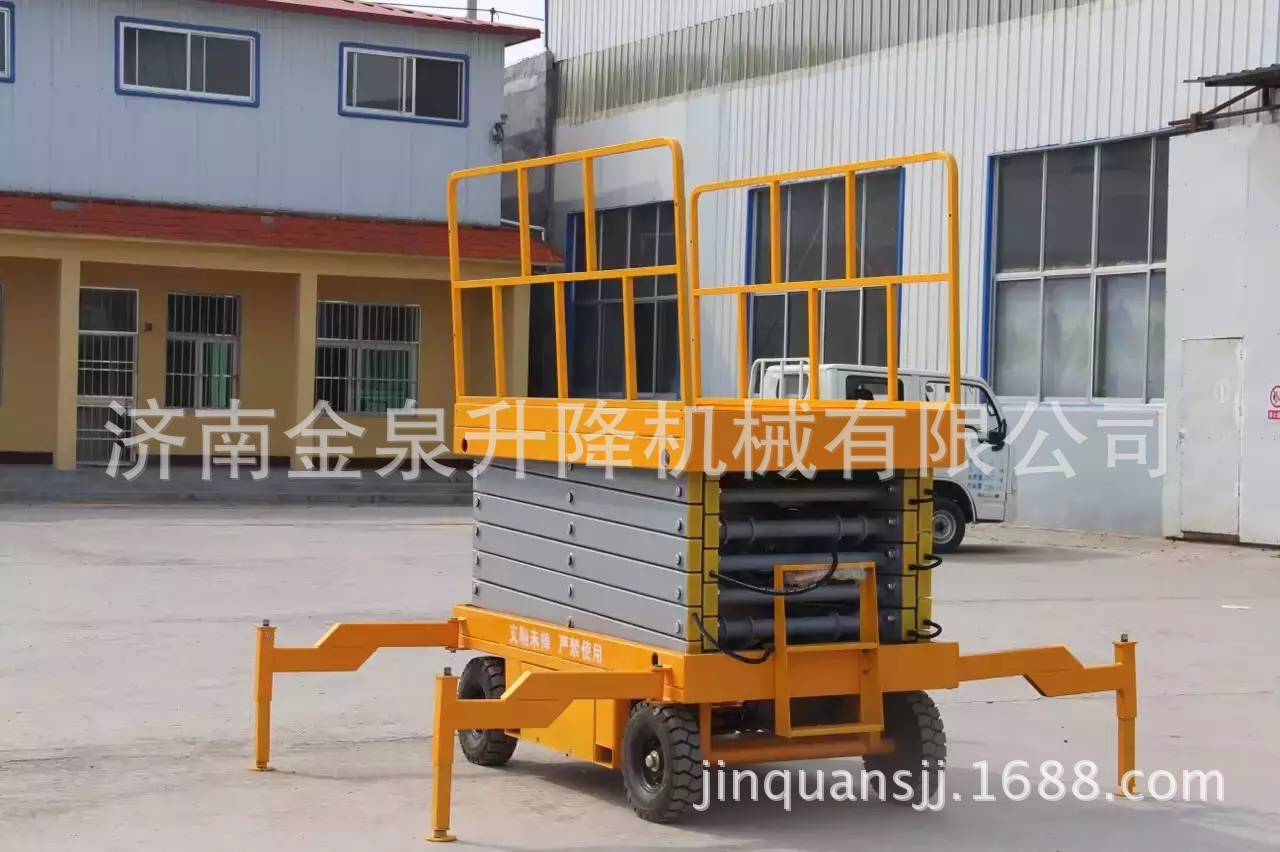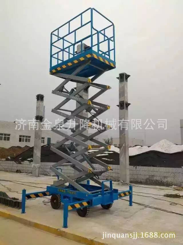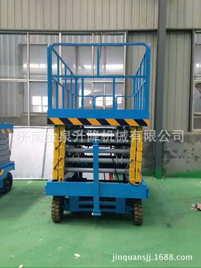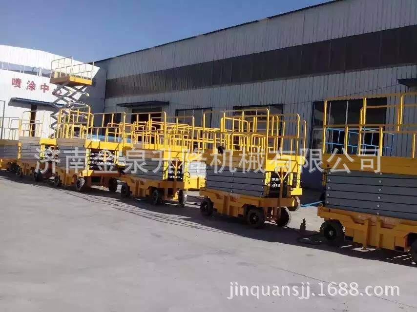 移动剪叉升降机是一种多功能起重装卸机械设备。液压升降平台分为:四轮移动式升降平台、二轮牵引式升降平台、汽车改装式升降平台、手推式升降平台、手摇式升降平台、交直流两用升降平台、电瓶车载式升降平台、 起升高度从1米至30米不等。还可根据用户要求定做特殊规格的升降平台。应用于工厂、自动仓库、停车场、市政、码头、建筑、装修、物流、电力、交通,石油、化工、酒店、体育馆、工矿、企业等的高空作业及维修。升降平台升降系统,是靠液压驱动,故被称作液压升降平台。 液压升降平台适用于汽车、集装箱、模具制造,木材加工,化工灌装等各类工业企业及生产流水线,可配装各类台面形式(如滚珠、滚筒、转盘、转向、倾翻、伸缩),配合各种控制方式(分动、联动、防爆),具有升降平稳准确、频繁启动、载重量大等特点,有效解决工业企业中各类升降作业难点,使生产作业轻松自如。二 操作规程:1、 工作前要认真检查升降平台各部件,重点检查螺丝连接是否可靠, 液压管路元件有无泄漏,电线接点有无松脱、破损等情况。2、 升降台升降前,支放好四角支腿,四个支腿应牢固的支撑在坚实 的地面上,将工作台面调至水平状态(目测即可)。接通电源,指示灯应亮。然后起动电机,油泵工作,在空载下升降一两次,检查各部位动作正常后再开始工作。当气温低于10℃时,应使油泵运转3—5分钟,确认油泵工作正常后方可进行。3、 作业人员进入平台后应关闭护栏门,插上插销,系上安全绳,载荷的中心(人站得位置)应尽量处于工作台面的中心位置。4、 起升下降:按“起升”按钮,启动电动机,电机旋转,液压系统工作,油缸伸出,平台起升;待升到工作所需高度时,按电机“停止”按钮,平台停止升降,即可作业,若不按“停止”钮,平台升至标定高度时(本机为8米)行程开关工作,平台停在标定高度。工作完毕,按“下降”按钮,电磁阀动作,此时油缸回油接通,平台靠自重下降。5、 液压平台使用过程中严禁超载(本机额定载荷为300公斤),在起升下降过程中平台上作业人员不得移动。6、 移动或牵引液压平台时应将支撑腿收起且平台降至最低位置,严禁作业人员在高位时移动平台。7、 当平台出现故障无法正常工作时,应及时切断电源进行维修,严禁设备带病作业,非专业人员勿拆卸液压元件及电气元件。8、请勿在地面不平稳的状态下使用本机器;请勿在平台未平稳,外伸支腿未调好,调平,着地不牢靠的情况下提升平台;9、请勿在平台上有人或升起时调整或收起外伸支腿;10、请勿在平台升起时移动机器,如需移动请先将平台缩合,松开支腿;11、请勿使用本机提升货物或设备,本机仅限于载人和工具作业;12、请勿在强风状态下进行室外作业;13、请勿在作业时向外用力推拉物体;14、请勿在平台护栏上坐卧、站立或攀援;15、起升平台下严禁站人或堆放杂物;16、请勿以本机器作为电焊中线接地之用;17、请勿在一切可以预见危险状况下使用本机。18、桅柱式系列升降机,额定载重量包括人与携带物品,切勿超载;19、使用前必须调好水平,否则不能使用;20、升降机在工作中不准移动或调整底座;21、不允许爬登、站立在载人平台的护栏上作业;22、应使用在坚实平坦的地面上,决不允许在临时搭起的台架、卡车(载重车、货车、无盖汽车)、床铺或者伸出的平面上使用;23、升降机工作时,不允许有任何负载碰靠侧面以防出现事故;24、 支脚下如地面松软,要做牢固的垫木,调整稳妥;25、升降机工作时,载人框架下不许站人;26、不能倾斜使用桅柱式升降机,紧靠高墙使用时,提升高度不得大于高墙高度;27、司机在每日工作前须先认真检查平台的电器系统、液压系统和机械系统是否正常,并将平台上下空载试行数次,检查有无故障和不正常现象,还须注意平台台面停层站准确度有无显著不正常的差距。28、司机在工作前将防护栏两端的活动门关牢锁死后鸣铃起动,严禁在防护栏活动门敞开情况下工作。在平台行驶中如遇特殊情况可使用急停开关停止平台,但在正常运行中,禁止使用急停开关停车。29、司机应负责监督平台运输的物品在台面上尽可能的分布均匀防止偏载,并禁止超载运行。平台不允许载人和装运易燃易爆等危险物品和禁止在升高时人员攀爬以及人为摇晃。30、司机在平台工作中严禁离开岗位和对平台进行揩拭、润滑或者修理工作。当工作完毕后,司机应切断电源,锁上控制盘方可离开岗位,并填写好交接班记录。31、平台发生故障或者有失正常工作时,应立即通知检修人员修理,如发现有危险性或可能造成人身机械事故时,应立即停用,切断机房总电源,报告管理部门,待修复并进行详细检查后才可使用。