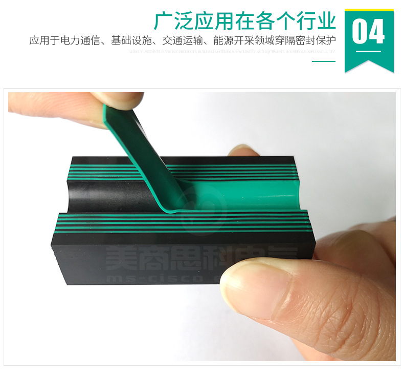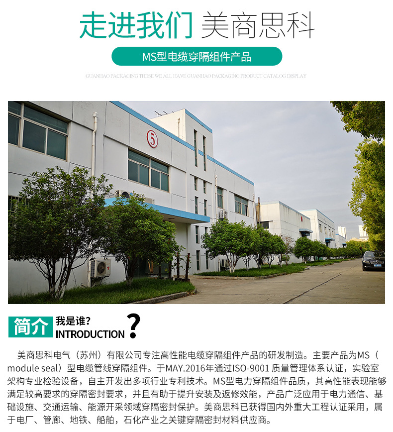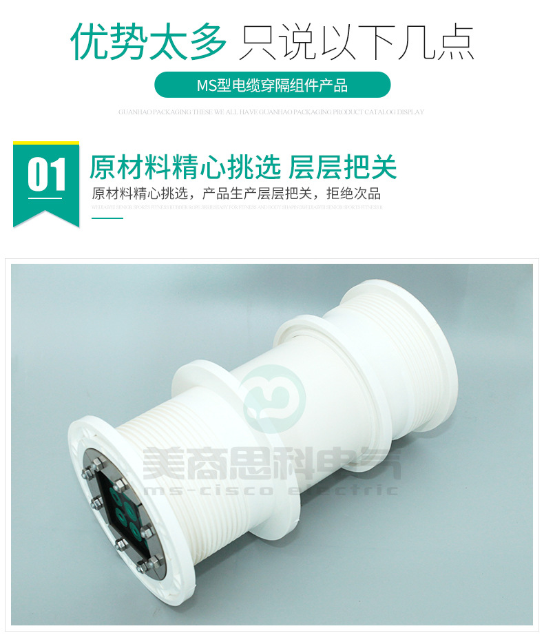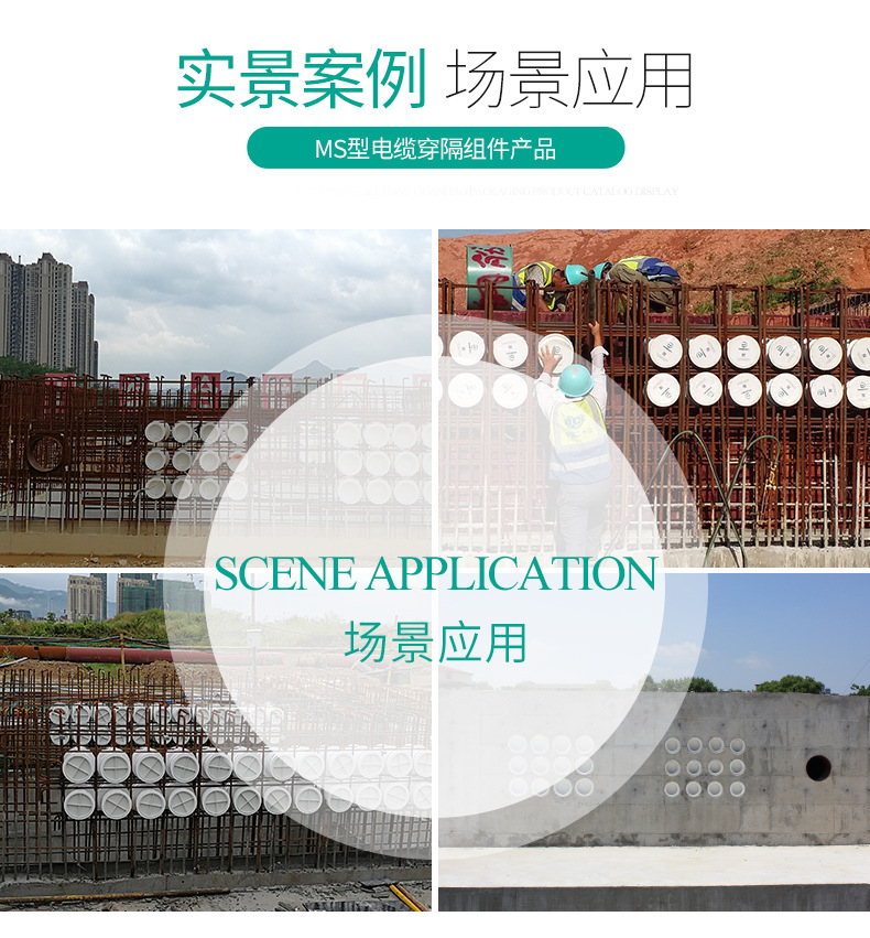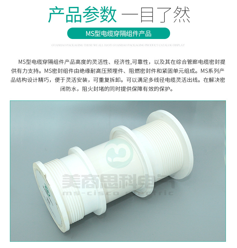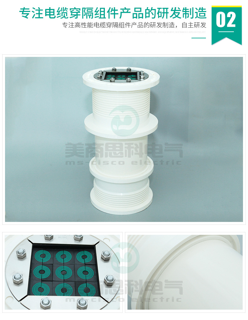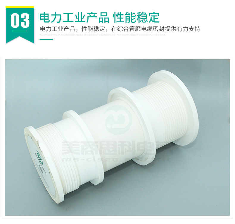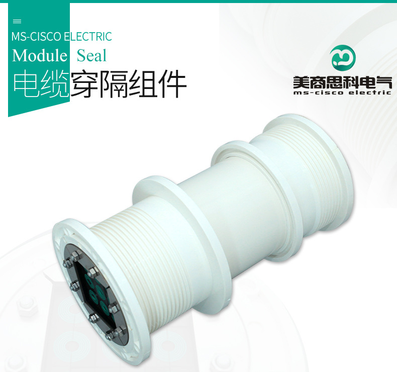电缆穿隔组件,又名:电缆防水组件,电缆密封件,是一种对穿墙电缆管线与预埋套管之间的空隙进行密封的封堵产品。MS(model seal)型电缆穿隔组件是一种采用标准化的密封模块对穿墙电缆管线进行密封和隔离的封堵产品;其一般由绝缘橡塑预埋件,多径密封模块及紧固单元组成;主要用途为电缆管线穿设墙体预埋套管后,对两者间的多余间隙进行封堵,防止水,气,灰尘,动物以及其它不友好环境侵入具有特定要求的场所;电缆穿隔组件现已成为电力通信,基础设施,交通运输,能源开发等众多行业和领域不可或缺的关键应用材料。