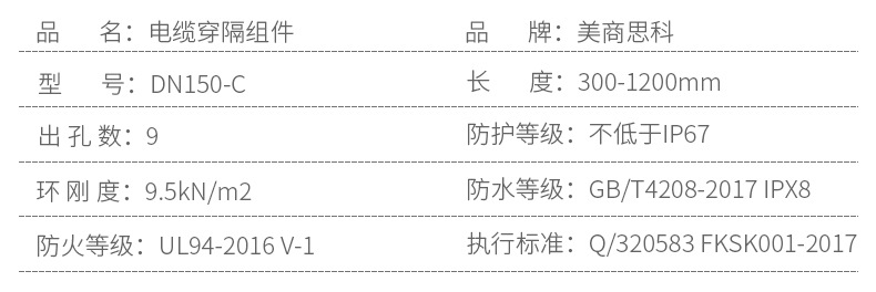 品名 | 预埋件型号 | 长度(cm) | 孔数 | 适用线径 | 防水等级 | 阻燃等级 |