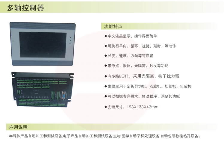 功能特点:1、中文液晶显示,操作界面简单2、可执行单向,循环,往复,延时等动作3、长度,速度,方向等可设置4、带原点,限位,光隔离,触发等功能5、有多路I/O口,采用光隔离,抗干扰力强6、主要应用于定长剪切机,点胶机,切割机,包装机7、可以根据客户要求,修改程序,满足其功能应用说明:半导体产品自动加工和测试设备,电子产品自动加工和测试设备,生物,医学自动采样处理,自动包装数控钻孔设备。