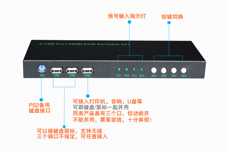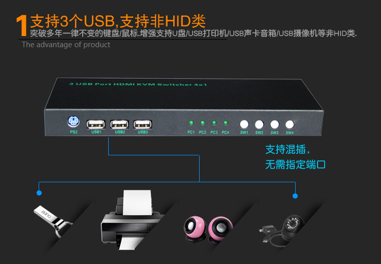 景阳华泰KVM多电脑切换器4口一控四USB键盘鼠标打印机共享器