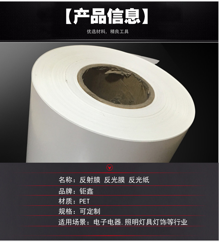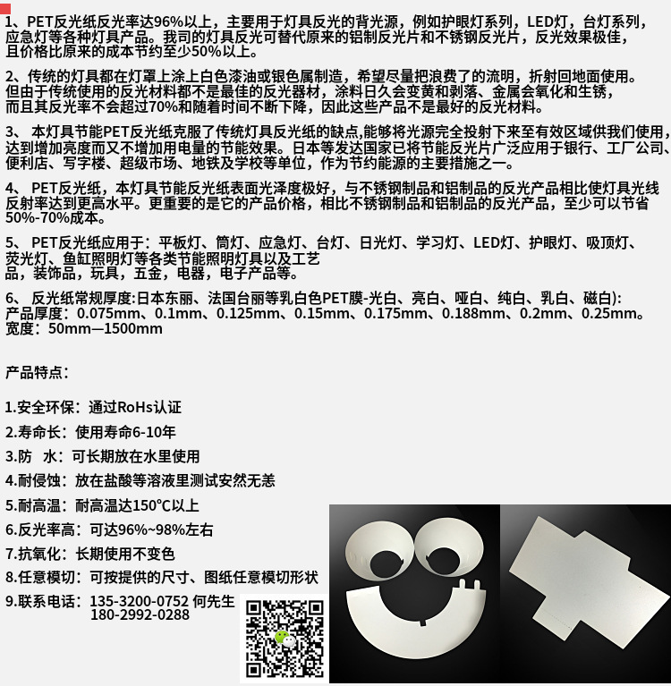 反光片优点:拉力强,耐高温,可任意模切成平面形状,也可以弯曲。反射片的应用范围很广,只要是需要增强亮度或在亮度不变的情况下大幅度省电的地方,都可以应用,长期使用,不变形,不变色。