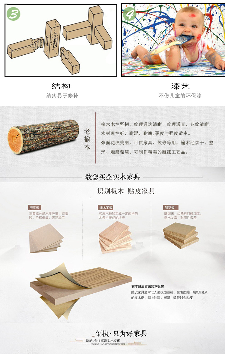 装饰老榆木择恰当的装修材料和空间色调。如多用一些自然木材、仿古砖、粗糙的红砖等材料,空间更朴实,更有自然的田园气息;与不同的材质家具的和谐搭档,可以给居室空间带来无限活力,但尽量少与玻璃等冷材料混在一起;搭配天然材质的布艺,令老榆木的前世今生结合得更完美;搭配具有自然古朴气息的粗陶瓷、藤或草编饰品等,更能提升和唤醒老榆木的“前世感木家具所代表的不仅是一种传统、更是一种文化、一种品味。店公告及商品图片说明: