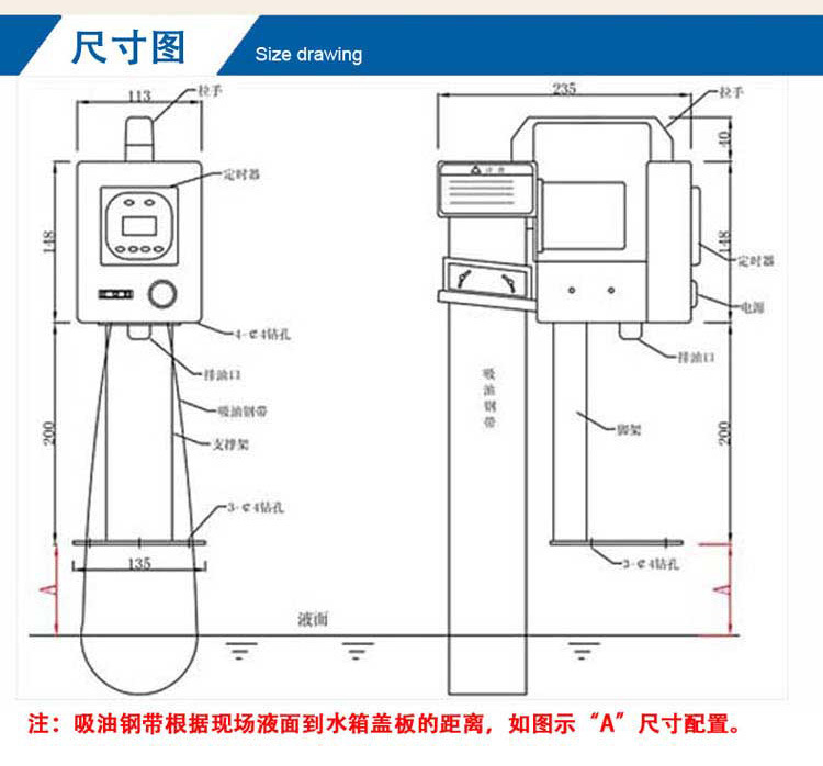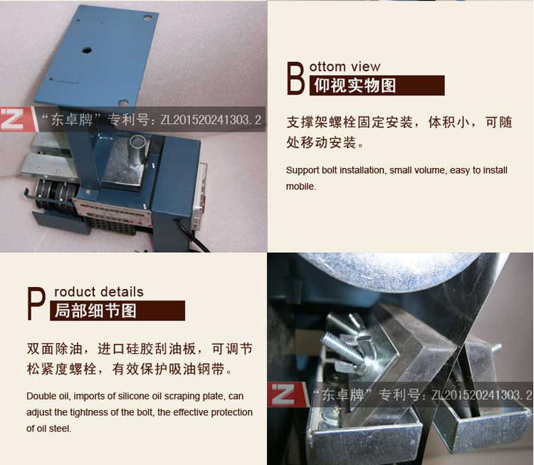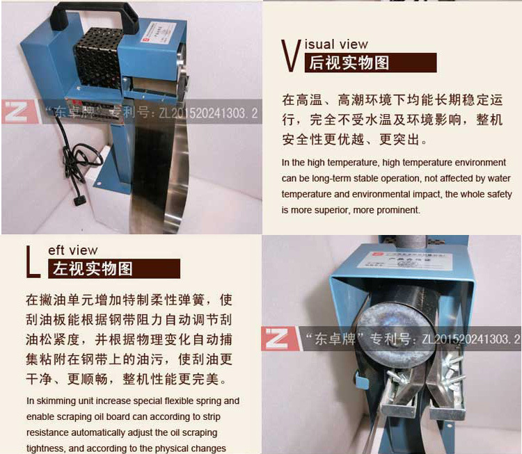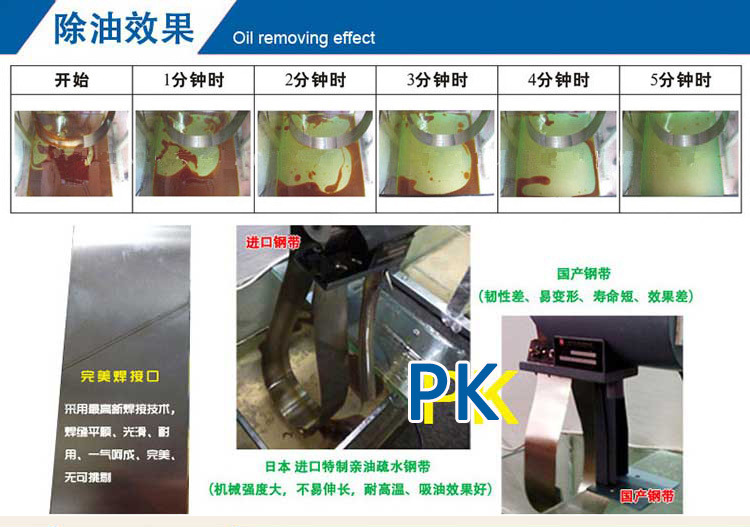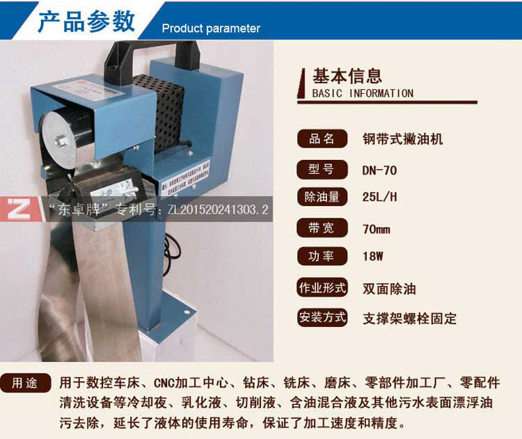 适用于吸除漂浮在水面上多种成份的废油,如(机油、煤油、柴油、润滑油、植物油及其它比重小于水的液体);不管水面上油层厚薄,均可使其聚集和回收。1,机床冷却箱内的浮油回收;2,清洗设备的浮油回收;3,空压机等冷却水箱浮油回收。4,冷却水内的浮油回收。5,其它排水设施的浮油回收。6,与磁性分离器组合分离铁粉、浮渣。7,常用于机床、地沟、排水坑、油池等。