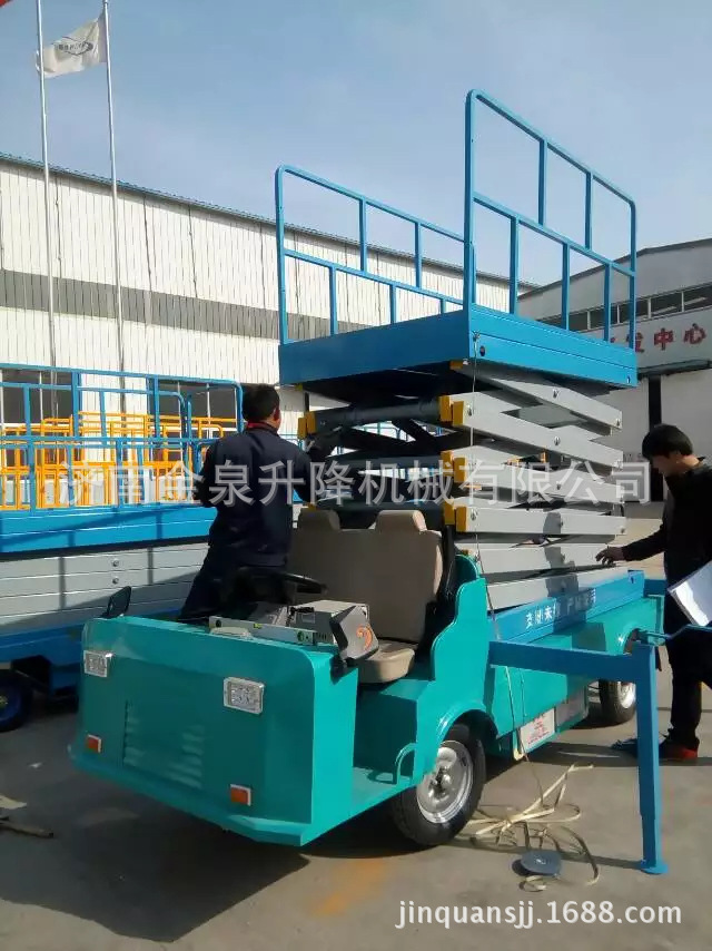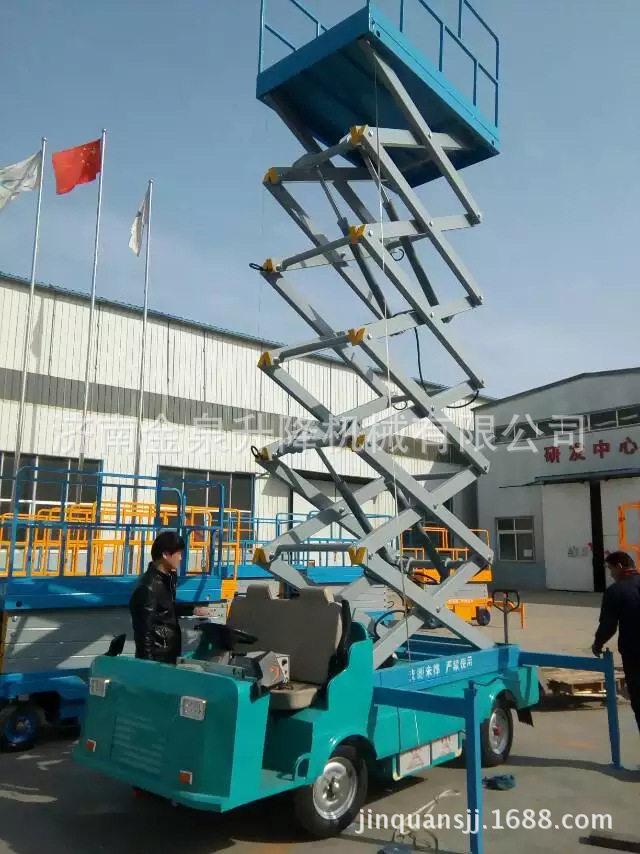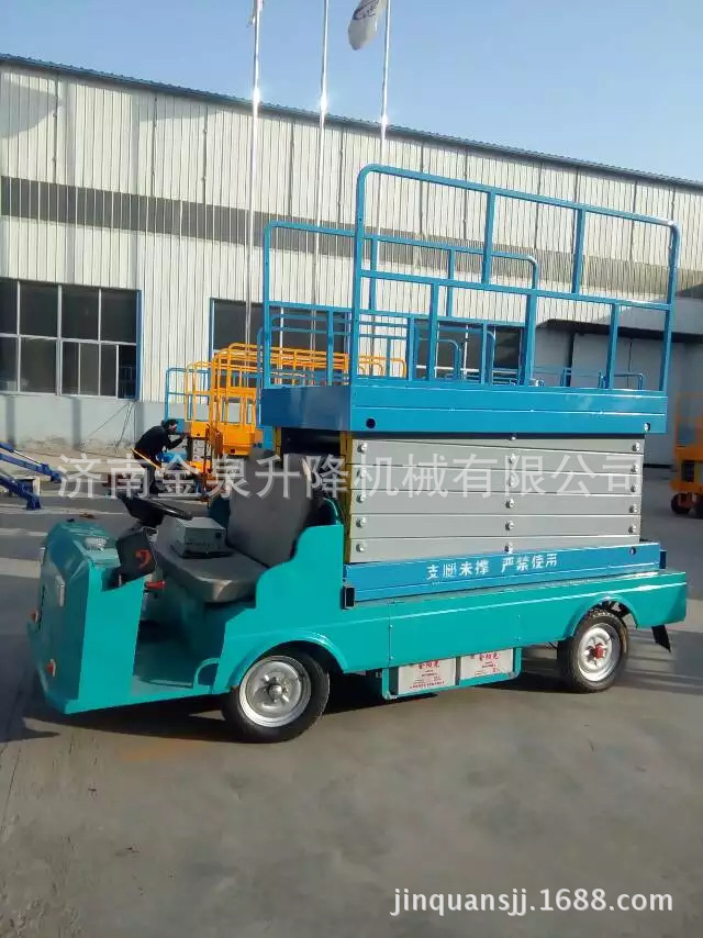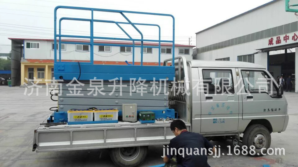 把升降机安装在汽车上的高空作业设备。由专用底盘、工作臂架、三维全旋机构、柔性夹紧装置、液压系统、电气系统和安全装置等部分组成。由升降机和电瓶车配套改装而成的高空作业专用设备。它利用汽车发动机或电瓶车原有直流动力,勿须外接电源,即可行驶又可驱动升降平台,它移动方便,作业流动范围广,产品具有无污染,无尾气,作业范围大,流动性强。特别适用于冷库、人群密集区域(火车站,汽车站,飞机场)。广泛用于城建、油田、交通、市政等行业。根据个人要求可设停电情况下的应急下降装置、平衡阀、自动保压等安全装置,防止液压升降机超载的安全装置、漏电保护装置和缺相保护装置、防止液压管路破裂的安全防爆装置。