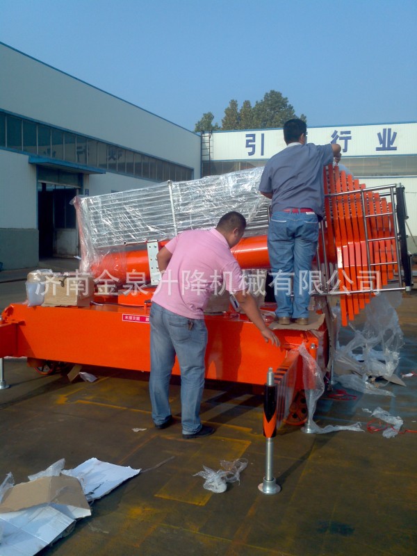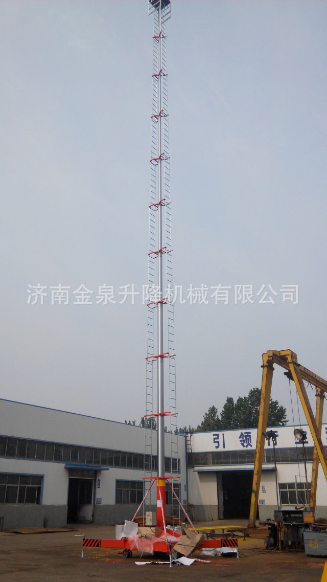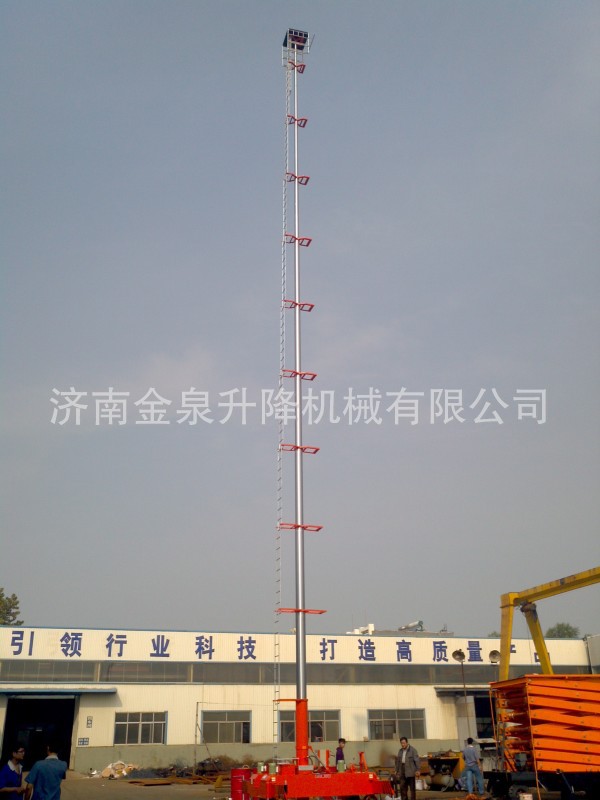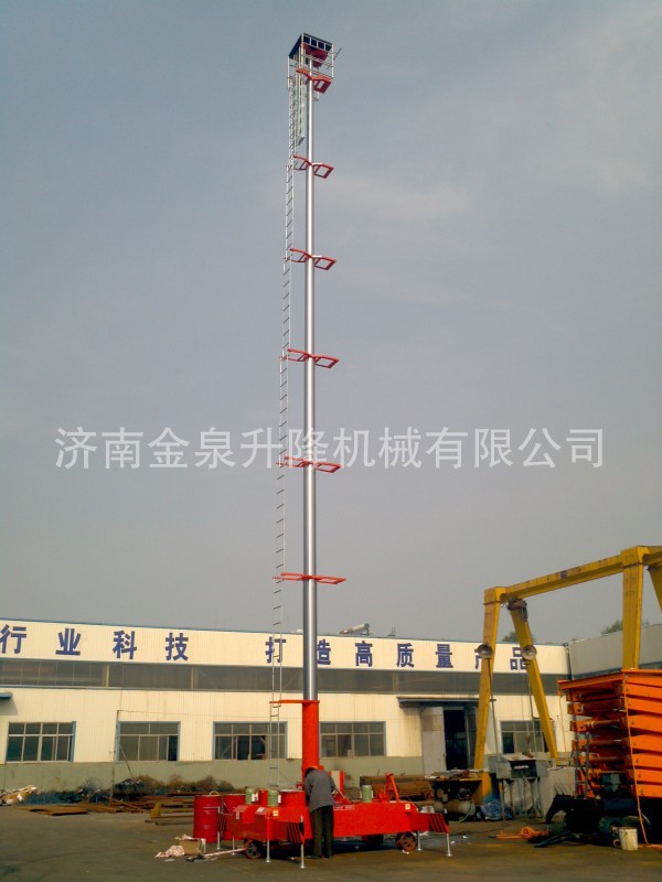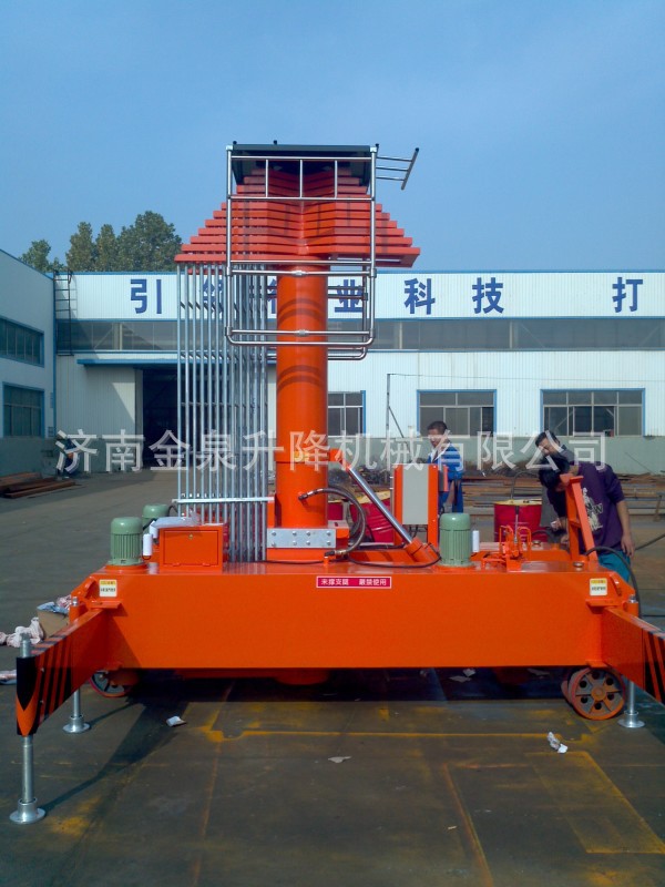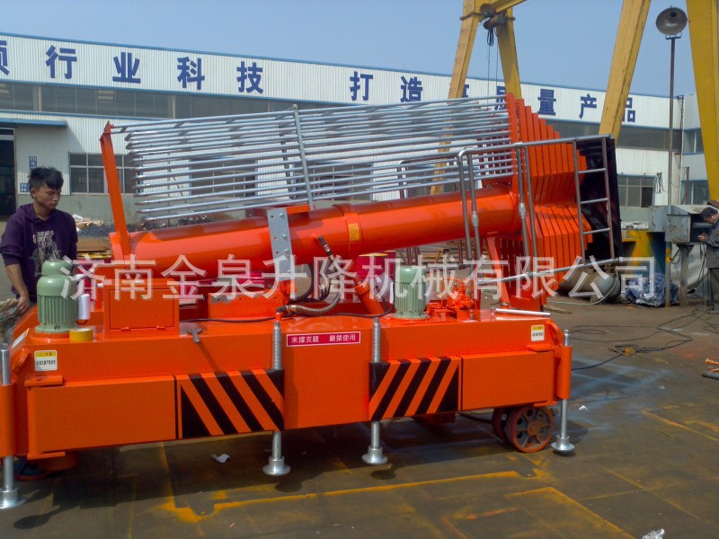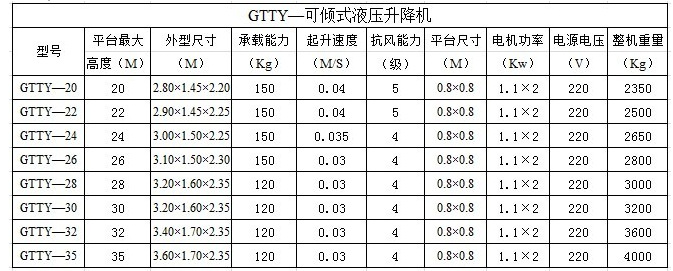 双梯可倾套缸升降平台,是一种多用途的高空作业机械,其功能将载有作业人员和使用器材的平台送到高度进行空中作业的特种工程设备。这种设备被广泛用于工矿车间、高大厅堂、仓库、车站、广场等高空作业。 整机由平台、伸缩油缸、单梯式或双梯式防转机构、底盘油箱、支腿、行走轮等组成。平台有伸缩油缸直接顶升,当启动电机时,有电机带动齿轮泵供油,油液经单向阀及电磁通道输入油缸,伸缩油缸则逐节上升,当平台升到最大高度时系统压力也就达到了额定工作压力,此时有溢油阀卸荷,油压保持在恒定的工作压力,停机后单向阀保压,平台便停留在最大的工作位置,平台可根据现场的作业高度在最大高度以下任意位置停留。 该设备适宜于大型的展览中心、高大的楼堂馆所,操作高度在20m以上,油缸倾倒时能自由进出大门,又便于安放保养。升降机最大高度可达35m,进口无线遥控操作。