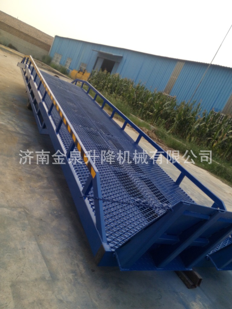 移动式登车桥产品简介:移动登车桥在现代物流现场已是一非常易见的结构形式。它是企业物流链的起点与终点,是企业快速、安全周转产品及货物的一个装卸货操作平台。装卸货操作平台的高度固定,但来往运输车厢的厢地高度不一,运输车辆与装卸货站台之间总是形成一定的高度落差或间隙。造成搬运叉车不能进出运输车辆直接装卸货物。运用登车桥提供可靠的连接。使搬运叉车能够安全、快速地进出运输车辆进行装卸货作业。使用过程平稳可靠,安全性能高,装卸货物时节约了大量时间,省却了大量人力,使装卸货物大大的提高了效率。