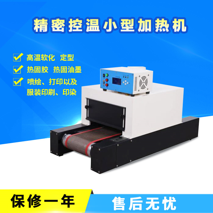 YH-200RA精密控温小型加热机,适用于产品高温软化、定型,印刷品、表面喷涂、电子原件、热固胶、热固油墨、喷绘、打印以及服装印刷、印染、食品等加热、干燥。本机为试验室或批量生产设计。速度调节均匀一致。传送带到加热管高度可以调节,适用不同大小的产品烘干。可不间断24小时连续工作,内有全方位反热材料,使产品受热均匀。