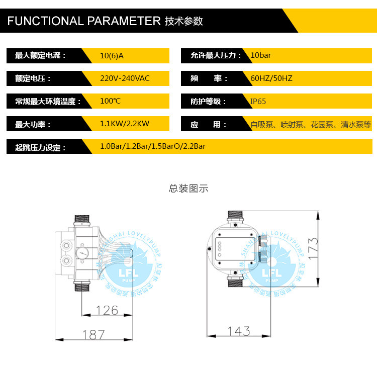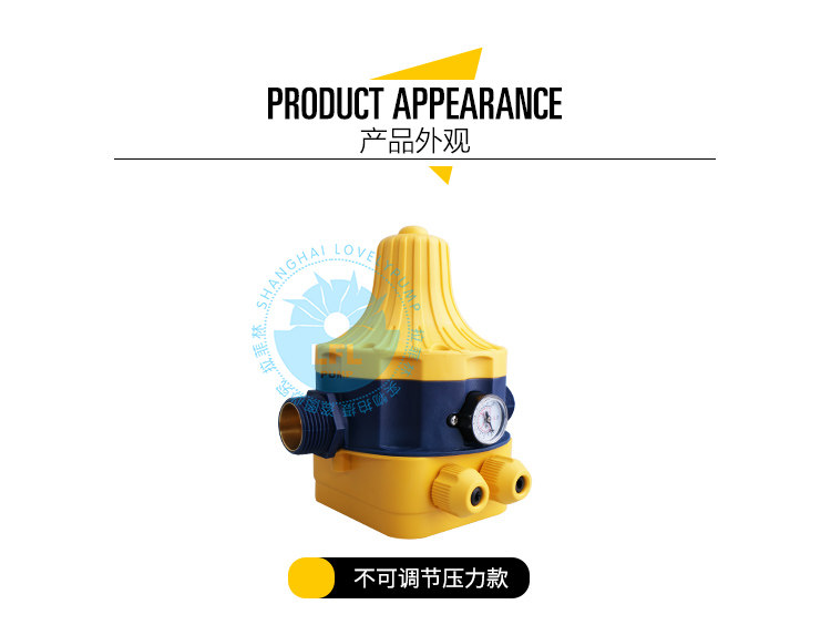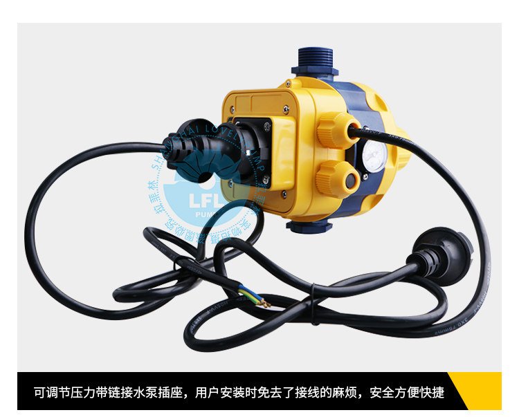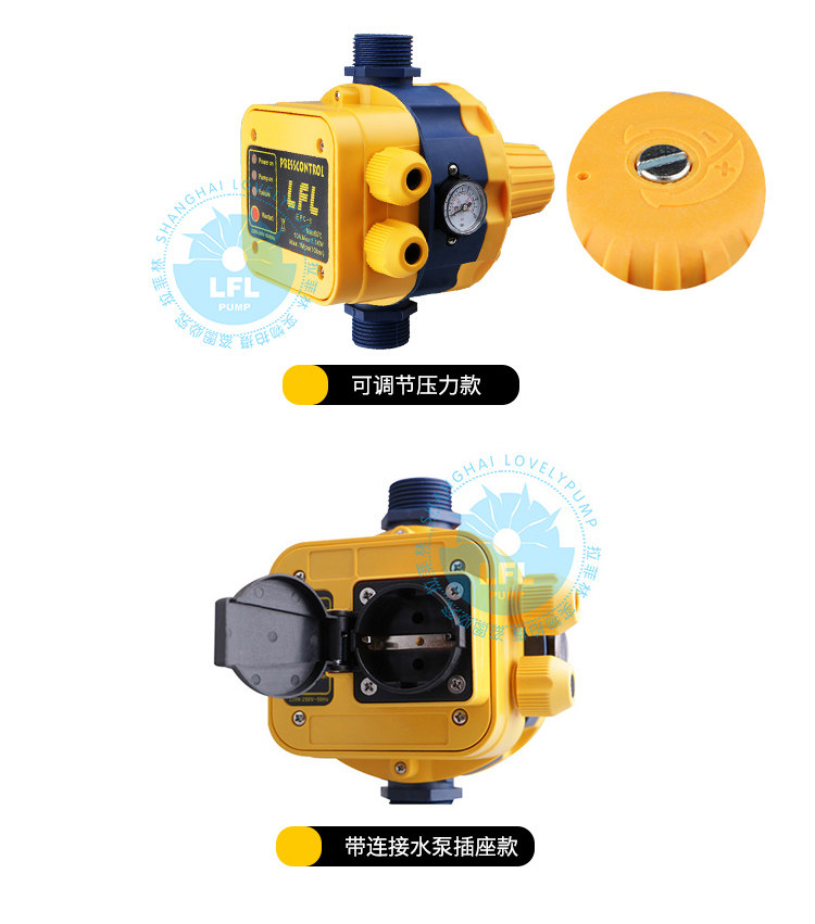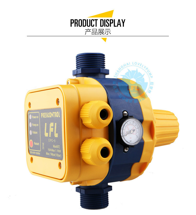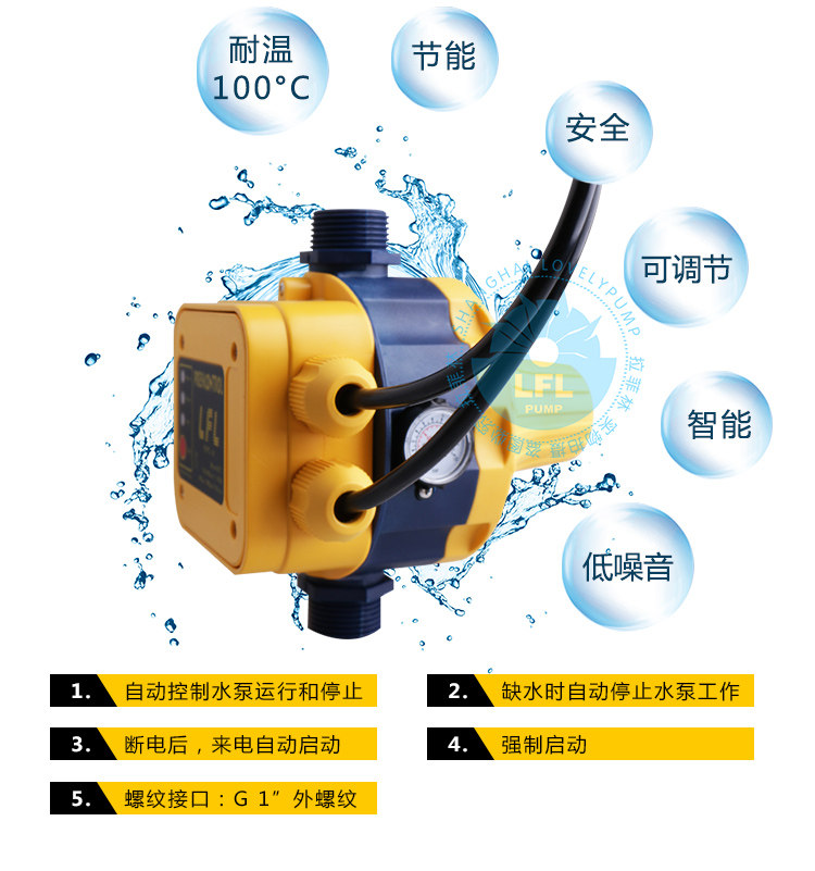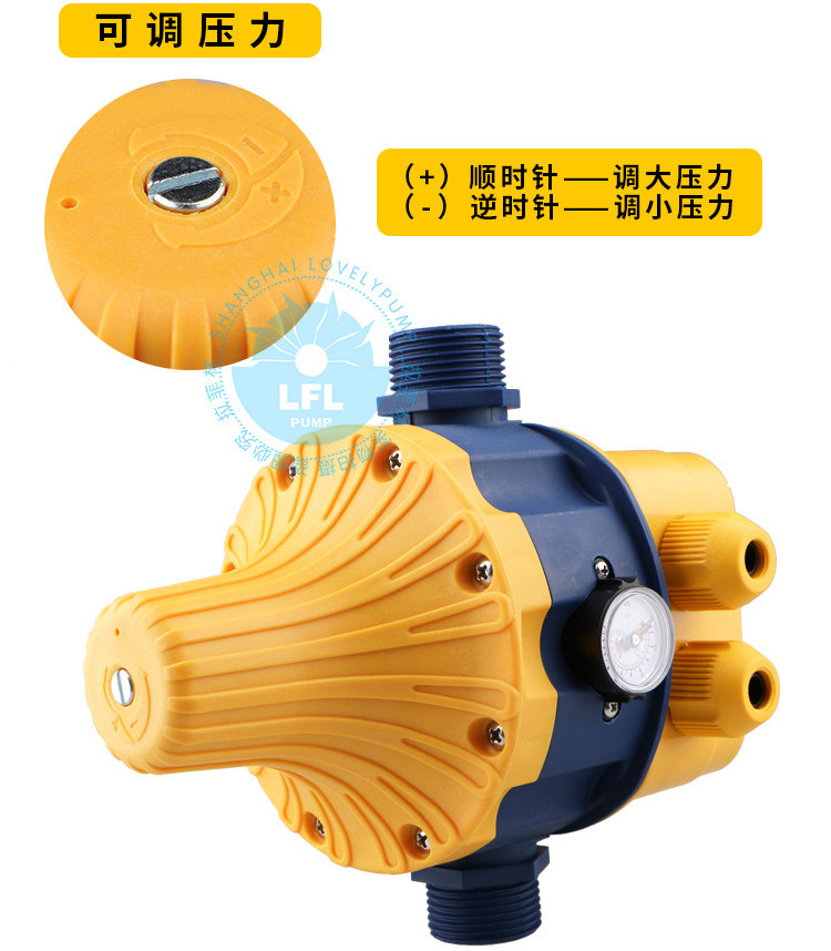二.水泵自动控制器的用途:自动控制水泵的开和关,有效保持水循环系统的压力。保护水泵,防止水泵空转。三.水泵自动控制器的好处:1、代替传统的水箱系统。2、根据开关水龙头来启动和停止水泵。3、在供水期保持恒定的压力,即水流的速度基本恒定。4、在缺水时候停止水泵,保证了水泵在缺水情况下不空转。5、减少水击的影响。四.水泵自动控制器的适用范围:1、灌溉用水泵。2、水井用水泵。3、小区供水系统。4、化工方面,强腐蚀性禁用。5、摩托艇水循环系统。6、汽车等的清洗用水泵。