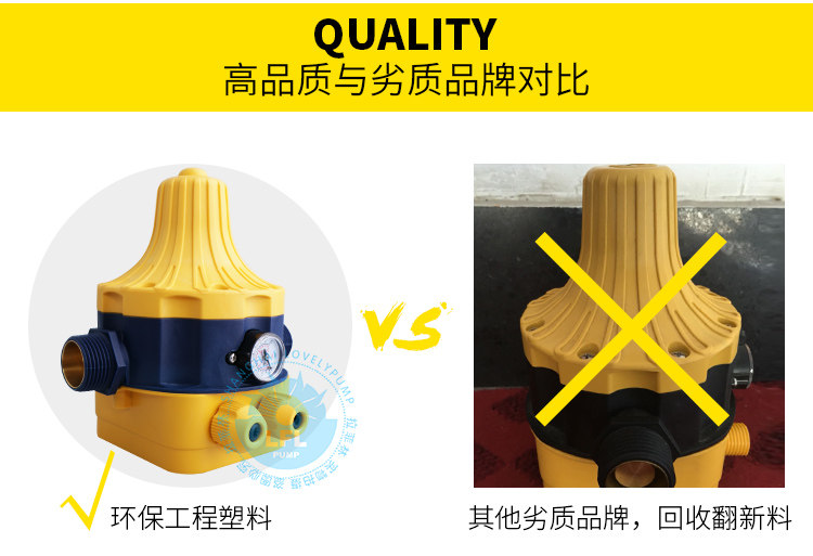 五.与压力开关相比,水泵自动控制器的好处:第一:寿命。机械开关可以使用1万到3万次,自动开关可以使用30万次第二:安全。机械开关在使用中会出现冒火花等危险现象,自动开关安全可靠第三:性能。机械开关是水泵频繁启动,影响水流稳定性,自动开关可以保持水流的稳定性第四:环保。机械开关配套的压力罐长期使用会产生锈,对人体危害很大,自动开关则环保无危害第五:保护。机械开关不能自动保护水泵,自动开关可以进行缺水保护,防止水泵无水空转,烧毁电机第六:普适。机械开关只可以陆上使用,自动开关可以拓展到水下第七:无噪音。机械开关噪音很大,自动开关噪音基本忽略不计第八:自动开关可以代替传统水箱系统第九:自动开关有效的减少了水泵启动关闭受到的冲击第十:自动开关美观大方