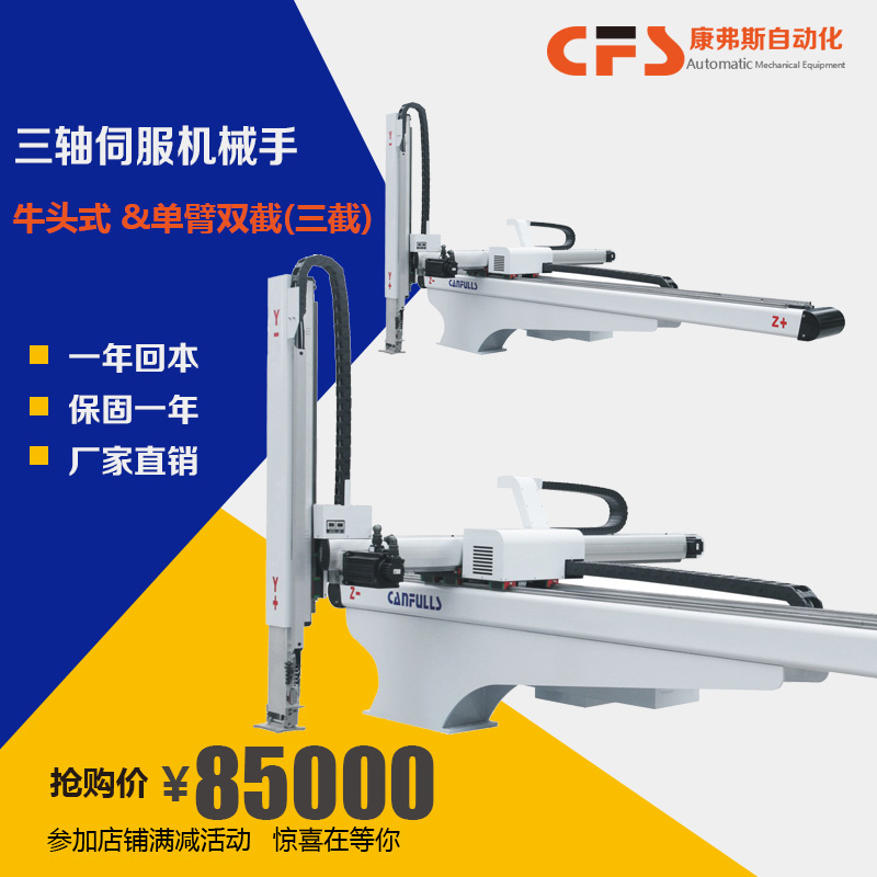 2. 引拔(X轴)、手臂(Y轴):优质铝合金型材经先进技术热处理后,通过精确加工与精密直线导轨合理配合,解决了传统机械手笨重、运行速度慢等问题,使机械手运行周期更短,大大提高生产效率。