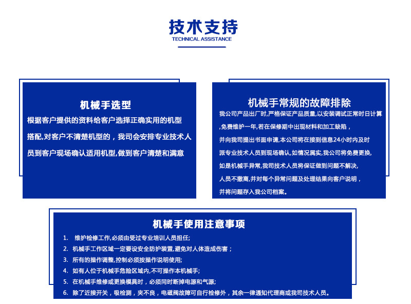 1.请每月进行全面检查机械手各安装螺丝是否松动。