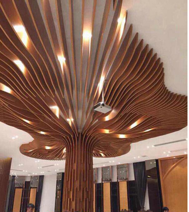【室内停车场条形铝天花防火木纹铝方通】 以逼真的天然木材视觉效果和立体木纹触感效果成为了建筑装饰引领潮流的先锋。具有木纹效果的铝方通产品代替木材,为保护我们人类赖以生存的绿色世界做出了贡献。