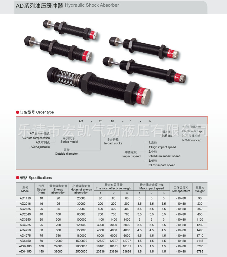 结构功能说明:1、油压缓缓冲器之主要结构为本体、轴心、轴承、内管、活塞、液压轴、弹簧等组成,当轴心受外力冲击将带动活塞挤压内管之液压油,液压油受压后将由内管之排油孔一一排出,同时由内管排出之液压油也由内管之回油孔回流到内管;当外力消失时,弹簧将活塞弹回始点等待下次的动作。依此原理,油压缓冲器将能把移动中的物体平衡有效的停止。2、消除非机械运动之震动和碰撞破坏等冲击。