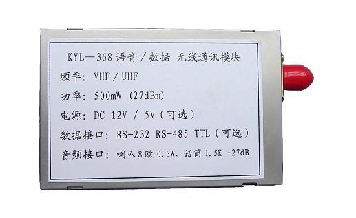 KYL-368是一款集无线数据通讯、无线语音通讯为一体的无线数传模块,该产品针对工业自动化领域设计,高可靠性、高稳定性。同时提供话音传输通道,可直接与话筒、扬声器联接,方便用户进行功能及应用扩展。