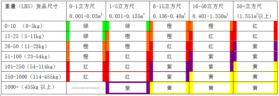 参照下表应该选择重量横行(54-114kg)与货品尺寸竖列(0.401-1.350m3)的交叉位置——紫L-55(37g)