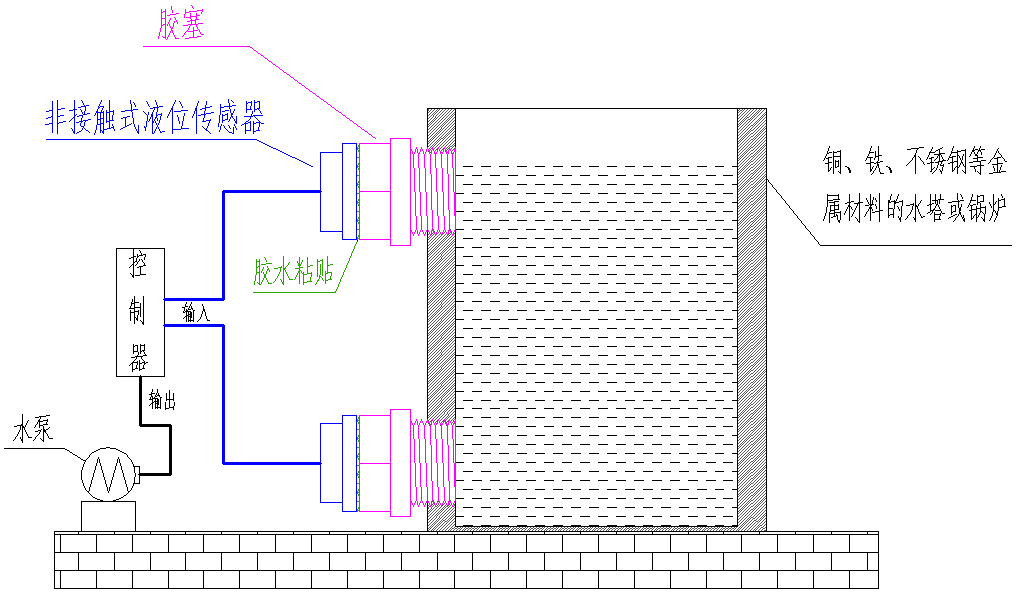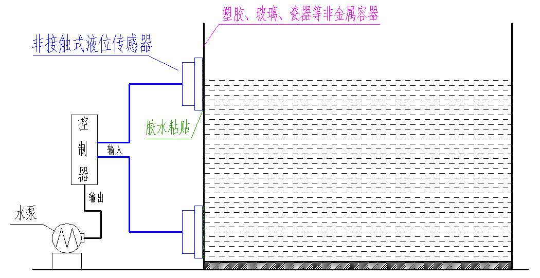 智能型非接触式液位感应器(以下简称液位感应器)采用了先进的信号处理技术及高速信号处理芯片,突破了容器壁厚的影响,实现了对密闭容器内液位高度的真正非接触检测。液位传感器(探头)安装于被测容器外壁的上下方(液位的高位与低位),非金属容器无需对其开孔、安装简易、不影响生产。可实现对高压密闭容器内的各种有毒物质﹑强酸﹑强碱及各种液体的液位进行检测。液位感应器对液体介质和容器的材质无特殊要求,可广泛使用。