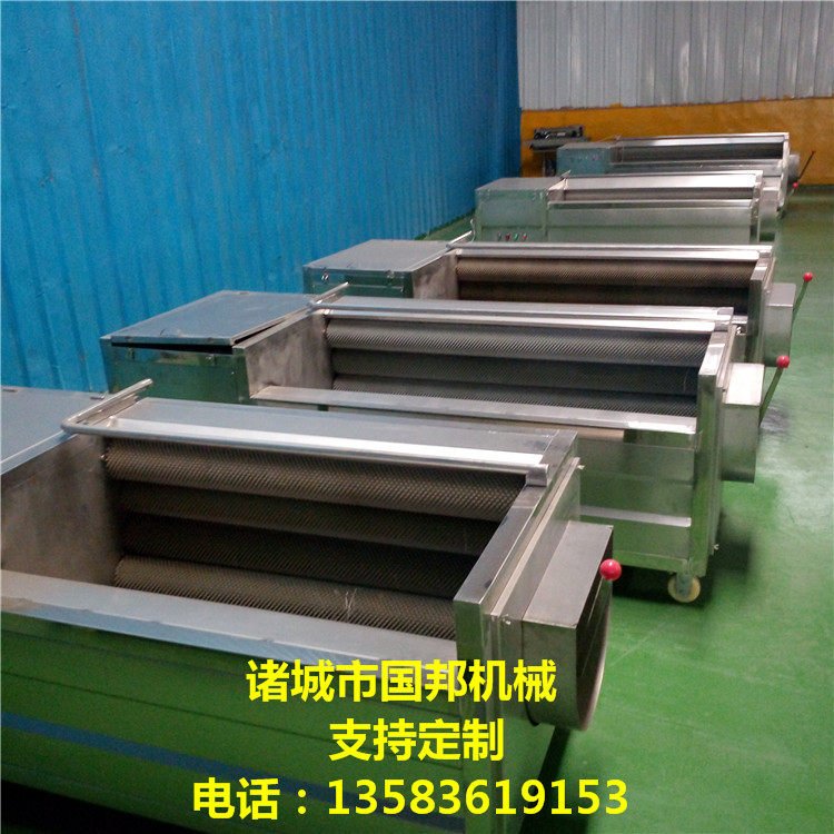 设备是由多根毛辊按照一条直线排列的,当毛辊在电机的同步带动下沿着出料口方向做自转运动;利用毛辊上毛刷的摩擦力与本身向心力作用下,物料沿着入料口位置向出料口位置运动;运动过程中毛刷与物料表面接触,去除了物料表面缠绕的毛发及其他杂质;在循环泵的作用下,水沿着喷淋管道进入喷头,对物料本身进行冲洗;用介质水冲洗物料可减轻物料本身与毛刷摩擦防止破损,同时把物料表面刷洗出的杂质及时冲离。