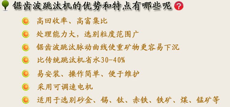 锯齿波跳汰机是现代重选设备 ,由于其处理能力大,选别粒度范围广,操作维护简单,作为粗选或精选被广泛用于选别 砂金、锡、钛、赤铁、铁矿、煤等矿物, 别是在锰矿、重晶石选矿领域中得到了广泛应用。