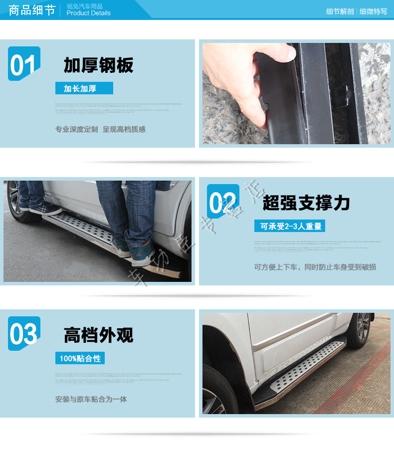 1、踏板采用ABS材料吹塑成型,表面烤漆处理,让车神显得神采奕奕的装饰作用;