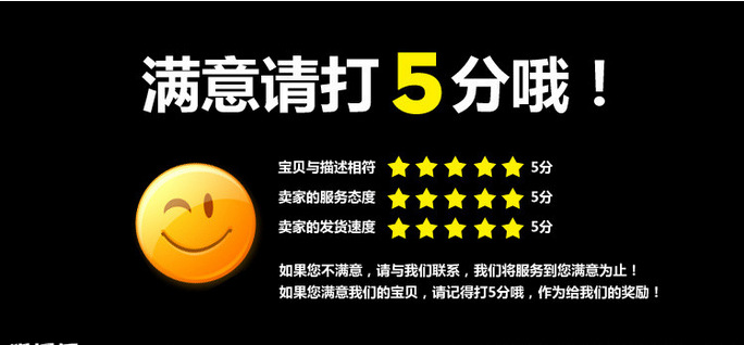 7、在收到货品后,若您对这次交易满意,请别忘了给我们好评的支持。若不满意或有何意见或建议,敬请告诉我们以便改进!