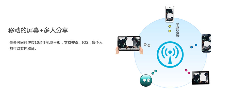 2 一机工作,可多达1-50个观看设备同时在线分享画面和视频。(例如手机、平板)