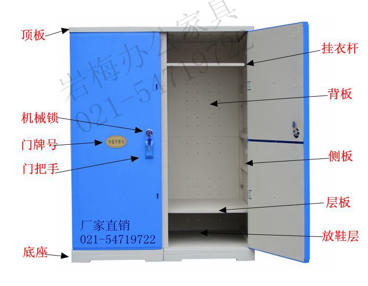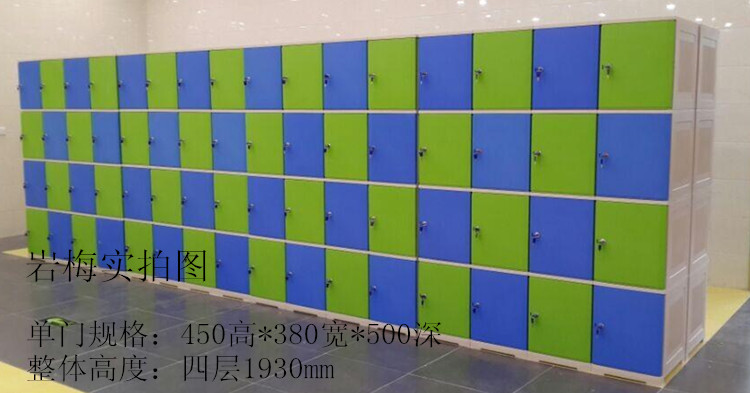 ABS 塑料更衣柜 | 材质:更衣柜全部为ABS工程塑料制成,强度高、韧性好、耐冲击,不易腐蚀,无毒无味,环保安全。 工艺:采用钢制模具注塑而成,榫接结构井字状加强筋。外平侧板为双层,呈纵横井字状加强筋. 特性:抗冲击、耐腐蚀、不生锈,设计使用寿命20年。 技术:采用大型注塑机通过温度、压力、时间,注塑成形。 颜色:色母溶于原料,可根据用户要求生产。采用美国色系PANRONG,高温注塑不易退色。 连接件:紧固件为塑料件,具有永不生锈、便于维护更新。门板与框架连接铰链,采用304不锈钢铰链,壁厚12mm. 产品组合为每层面独立顶板和底板,对以后维护、移动方便,并外侧框架为平面双层侧板。(附外侧平板,共用侧板结构图) 产品:所有型号门板均为整块模具一体注塑成形。 板材厚度: 侧板(22mm)、顶板(22mm)、底板(22mm)、门板(32mm) 底座(50mm) 单门规格:(常规规格产品) 300高*380宽*500深mm 450高*380宽*500深mm 600高*380宽*500深mm 900高*380宽*500深mm 整体高度: 300高*380宽*500深mm 5层整体高度1650mm 450高*380宽*500深mm 4层整体高度1930mm 600高*380宽*500深mm 3层整体高度1920mm 900高*380宽*500深mm 2层整体高度1900mm | 品牌:岩梅 每门产品配置(型号不同以下配件有所不同): 门号牌1个 锁具1套 拉手一副 挂衣杆1个 层板1个 |