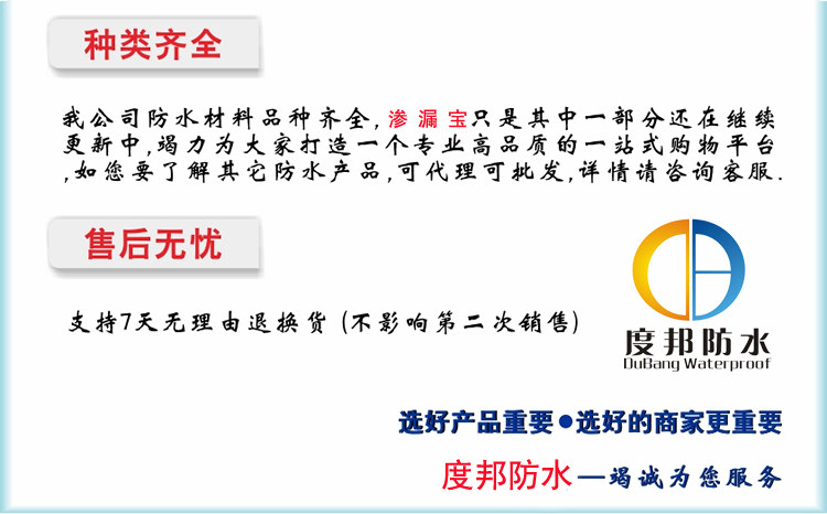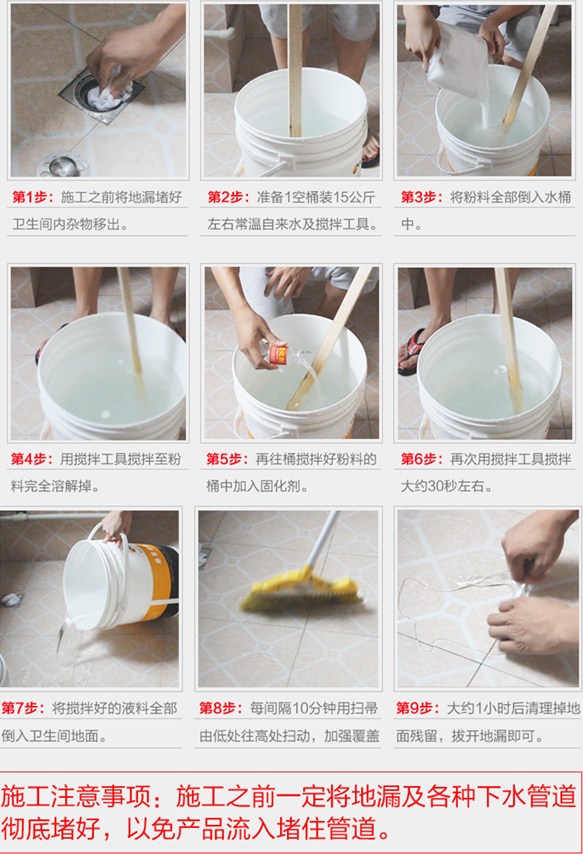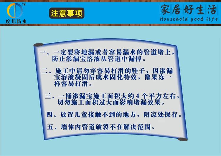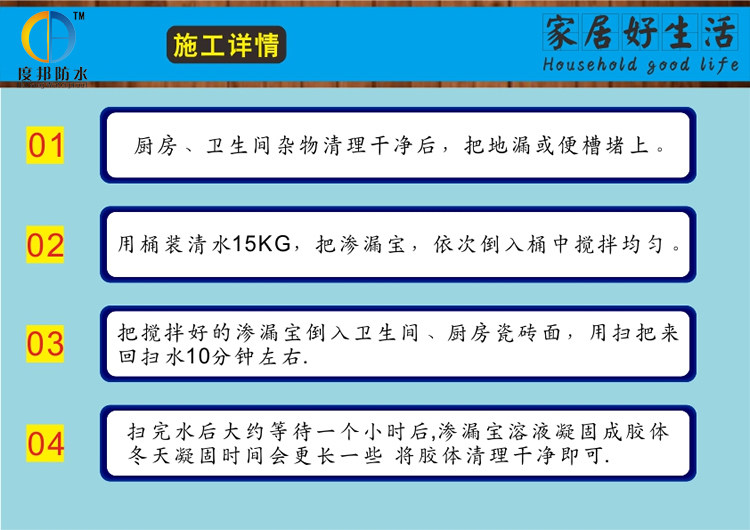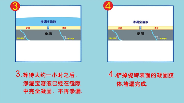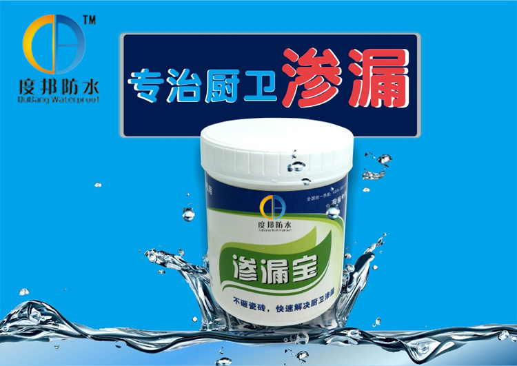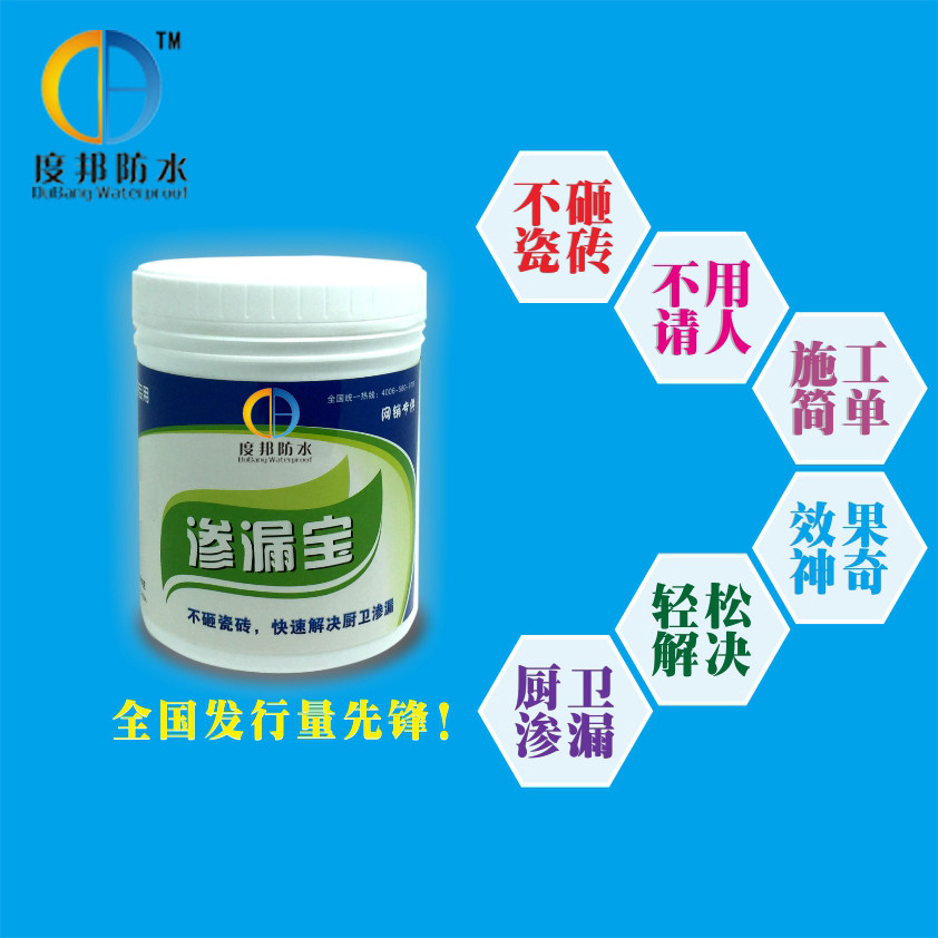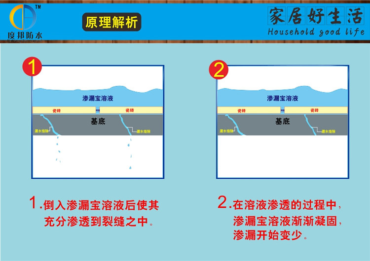 为了解决厨卫浴长期渗漏的难题,我公司研发的免砸砖厨卫浴渗漏宝,是国内唯一一家采用AB双组份水性渗透,渗透后又固化成透明有弹性的固体的材料,该材料能把所有渗透到的地方都固化成一个整体,达到最佳防水补漏效果。本产品绿色环保,无色无味无毒,施工简单,不砸砖不勾缝,不注浆,不改变原有任何设施和外观,施工简单见效快,一小时左右即可不漏不渗。