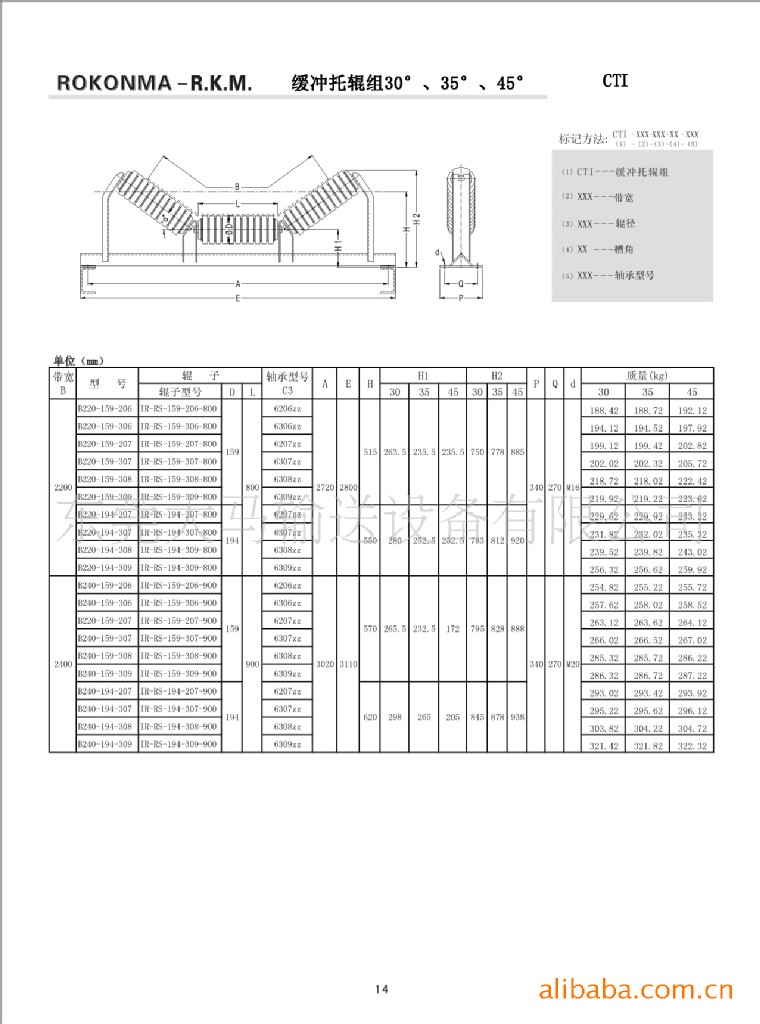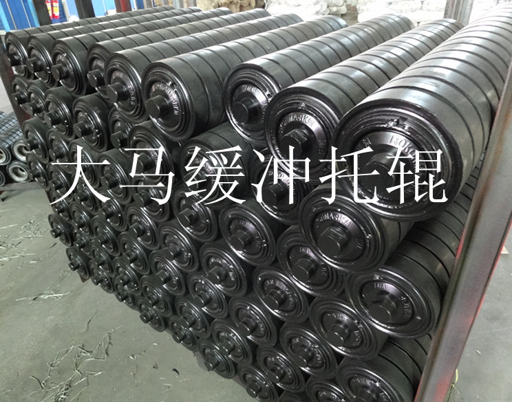 缓冲托辊组安装在输送机受料段的下方,减少在输送带所受的冲击,延长输送带的使用寿命。标准槽角一般分为30°,35°,45°三种.包括标准型和前倾型两种,前倾型可全程布置以防止输送带跑偏.