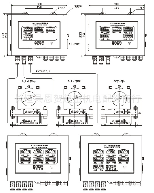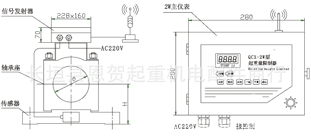 采用51系列单片机技术,数字化电路设计,仪表具备自动校验、毛净重切换显示、零点跟踪等功能。传感器信号通过发射器无线传输给显示控制仪表,遥控距离在200米左右,信号发射器和主仪表均需配置AC220V电源,其它指标和QCX-M系列基本一致。