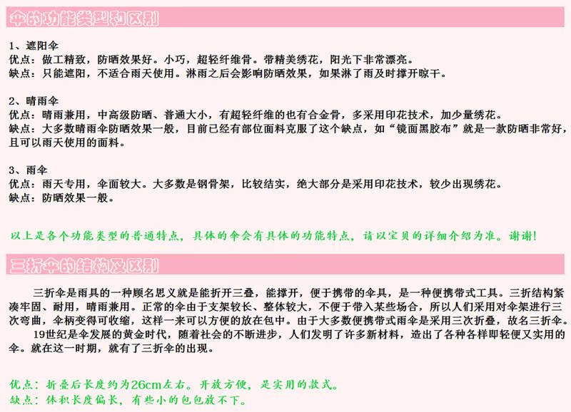 三折遮阳伞/货号YBL-2340/重量:340g/布料:碰击黑胶布/规格:54.5*8k/打开后杆长:66cm/收拢后长度:25cm/亲,由于阿里没有提供伞类 选颜色的图片功能,只能依次看号数选颜色。望理解!