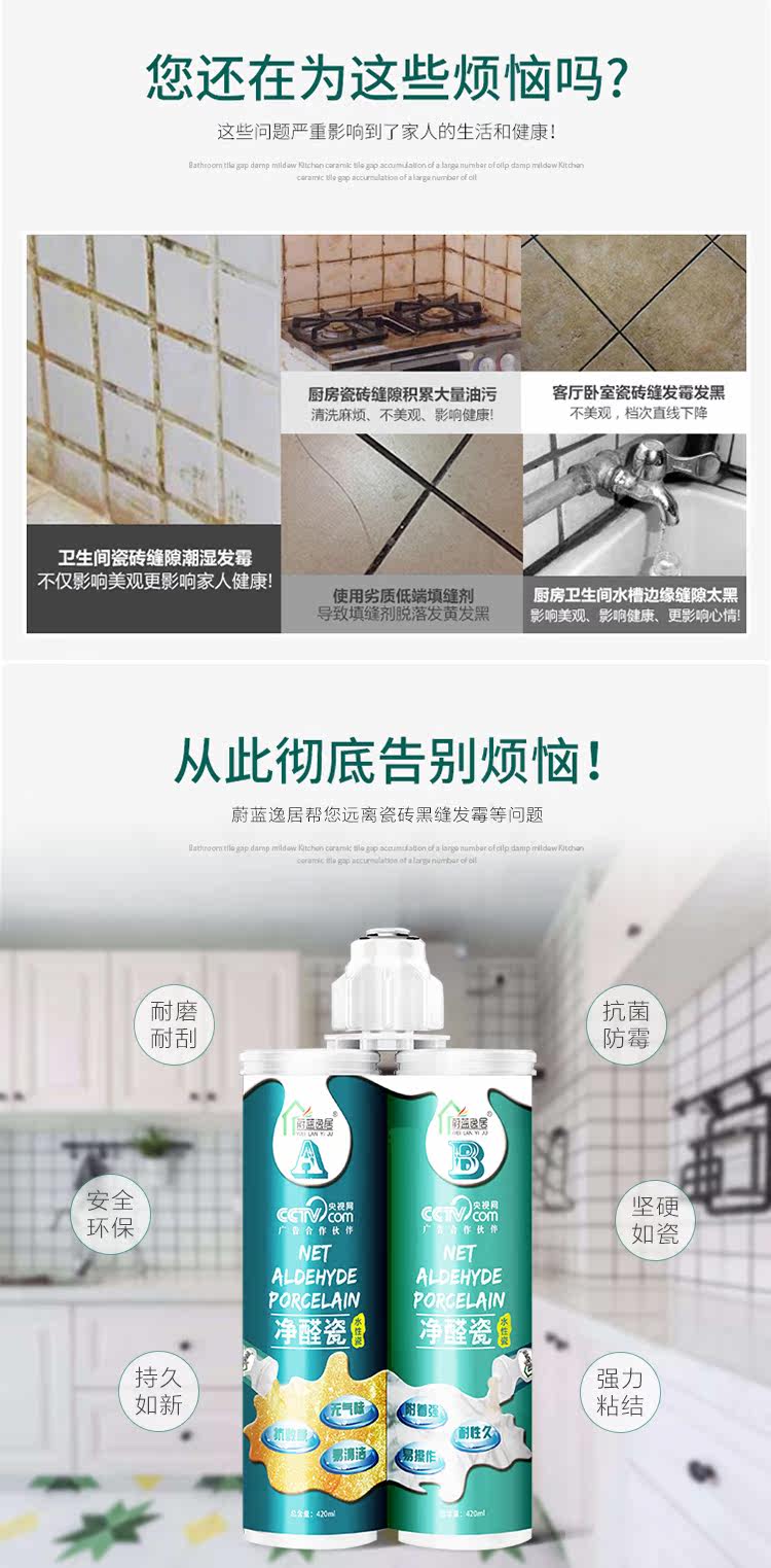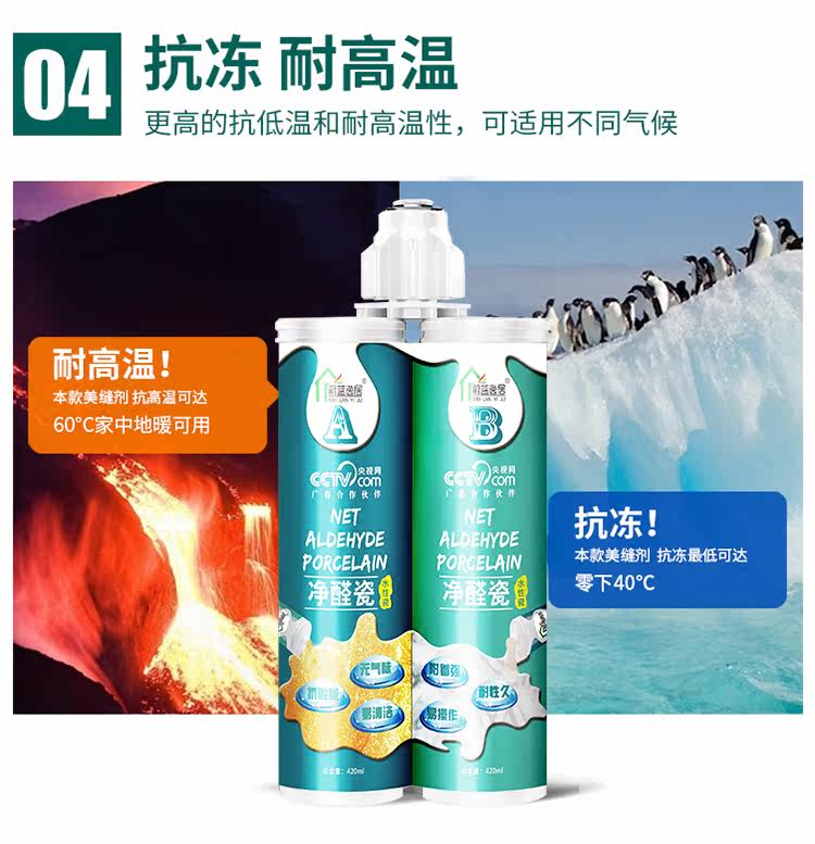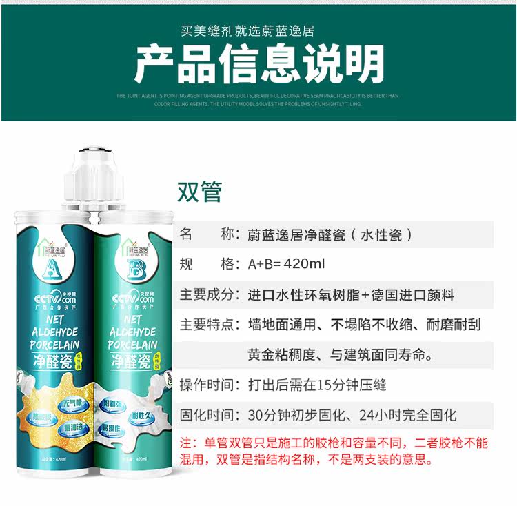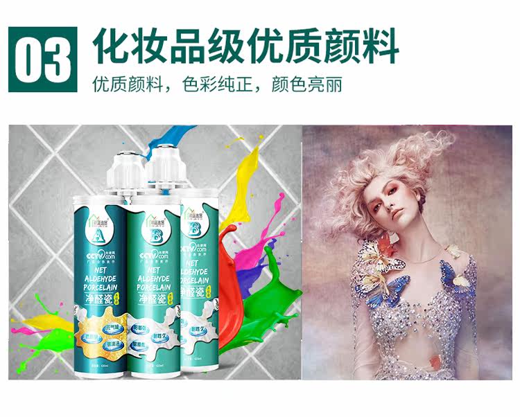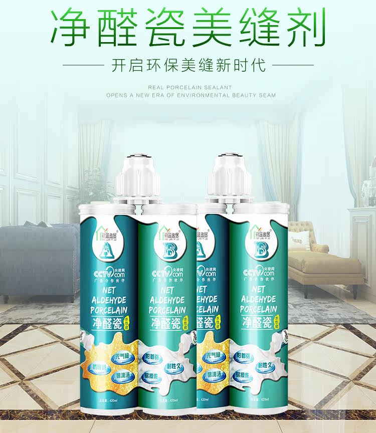 净醛瓷美缝剂是一种采用进口水性环氧树脂为材料的双剂型高档绿色环保产品。它由均可水洗的A组分硅砂、色粉和B组分特种添加剂构成,既适用于水平面也适用于竖面。具有颜色丰富、抗酸碱、快硬快干、色泽均匀、耐久性好、施工便捷、光泽度高、附着力强、环保性好、施工操作便捷、无气味、耐污易清洁等优异性能,适用于任何种类瓷砖的缝隙,尤其是在处理马赛克、异形砖等小体积瓷砖缝隙时效果显著。它以水为分散介质,不含有有机溶剂,不会造成空气污染,满足当下的家庭装饰环保要求,给消费者一个环保健康的居住环境。