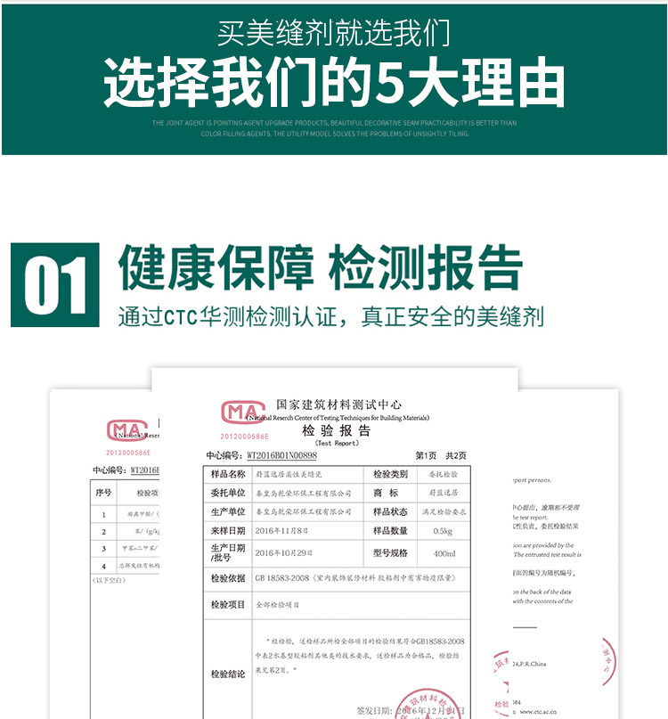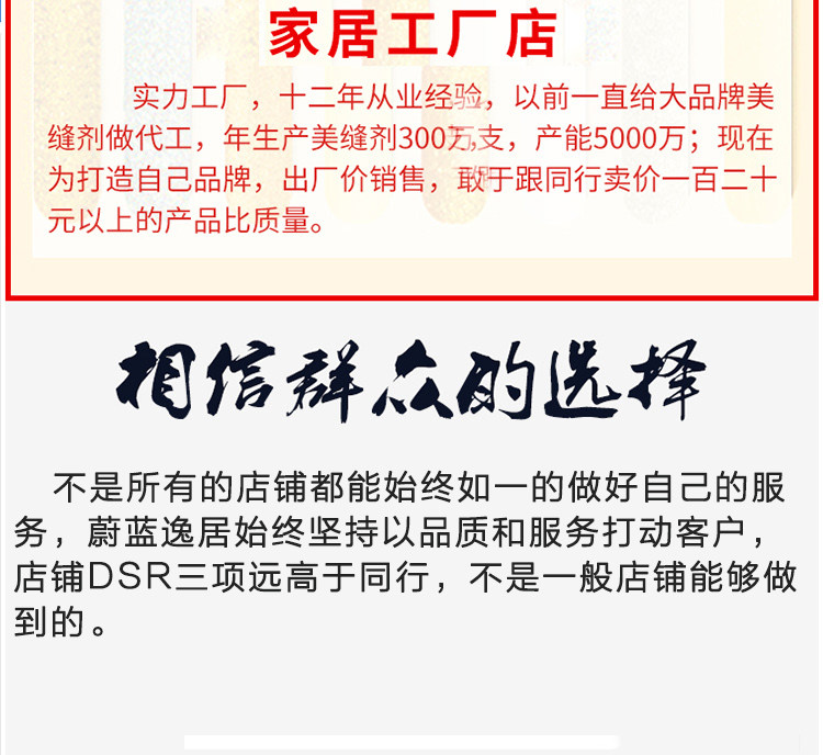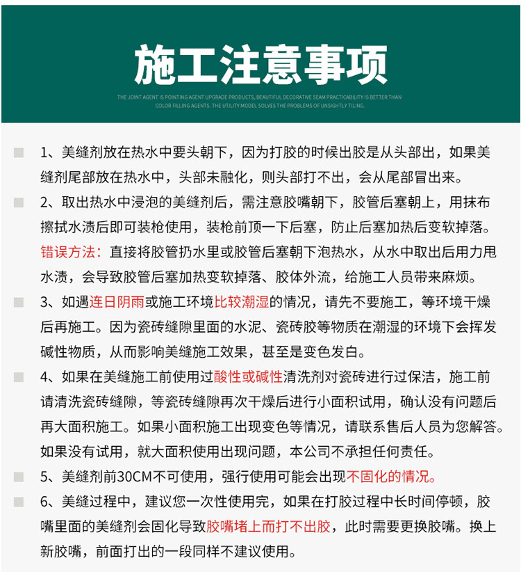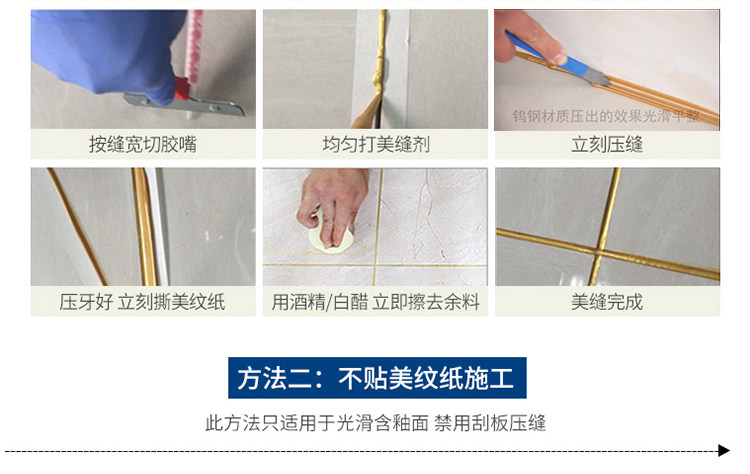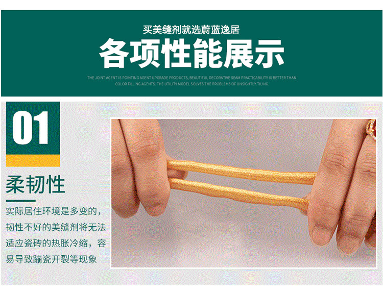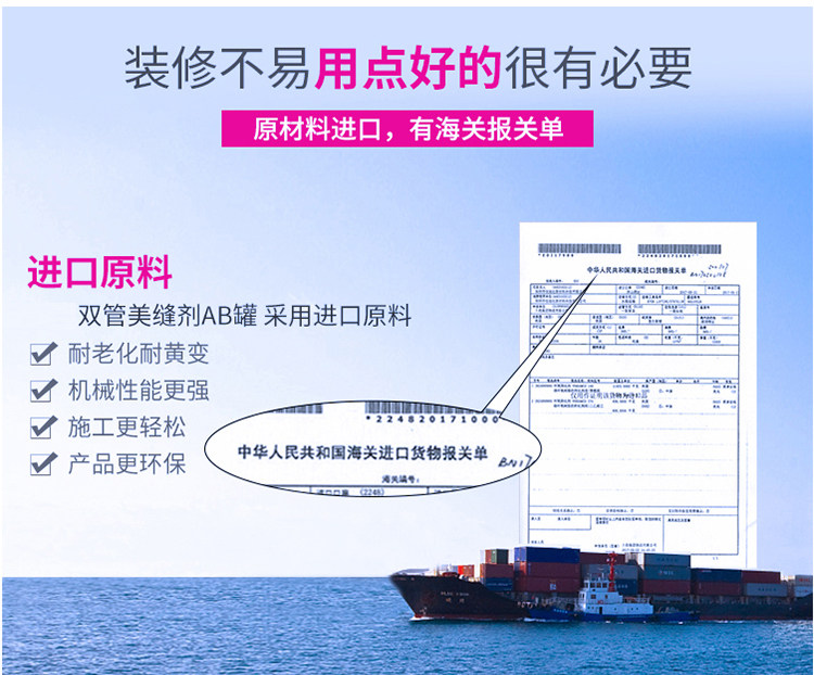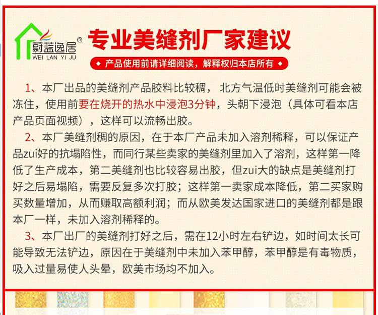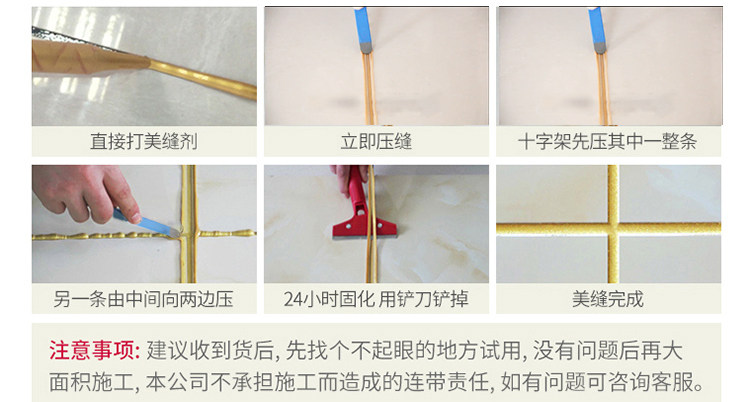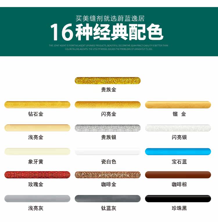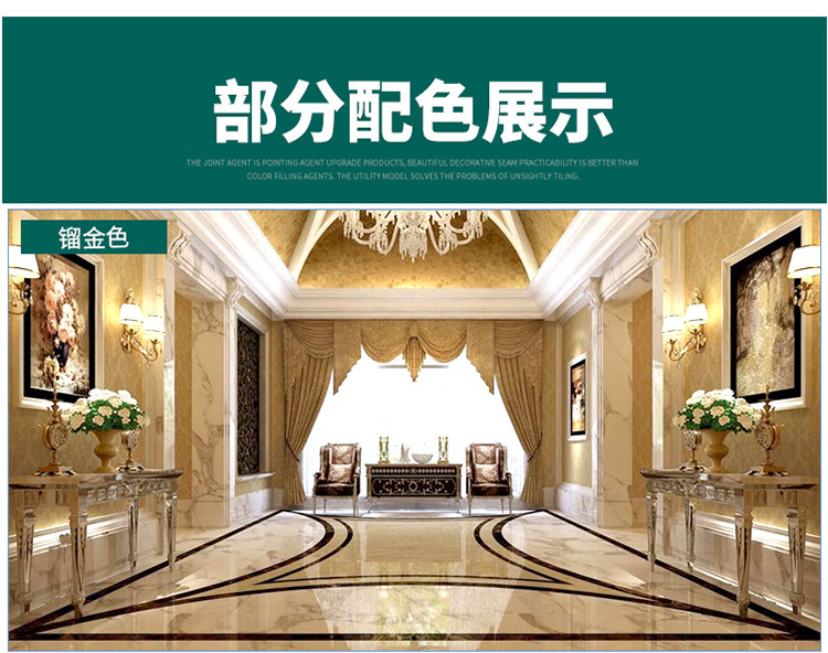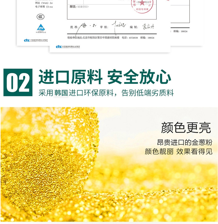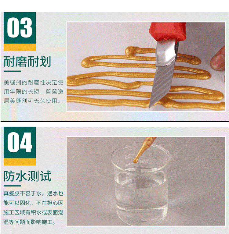 韩国进口原料,金粉含量是普通美缝剂的四倍,质保20年不塌陷,20年光亮度持久如新,防水防霉,长效抗污,效果高于市面的产品