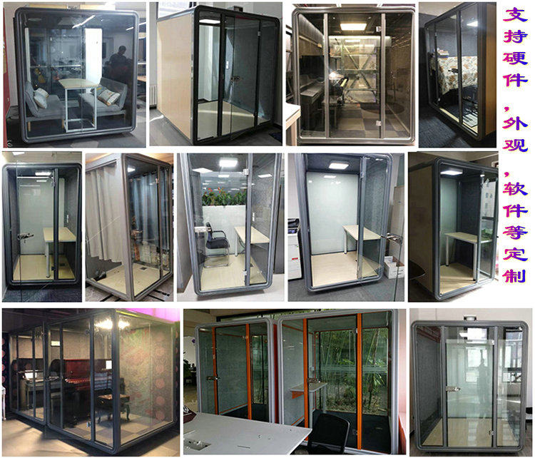 产品特点:能有效节省空间,应用更广泛,随心移动更方便。适合场所:大型购物中心,电影院,商校,咖啡馆,休闲娱乐场所,主题餐厅,商业街等。定制隔音房,自带通风系统,回厚网结构(坚硬牢固,拆装简单),加厚钢化玻璃(有效隔声音传导),高密度及暗板材(内置吸音棉,消除杂音)。隔间房适合用于:工作室,电话亭,钢琴室,练鼓室,吸烟区,娱乐室,休息室,洽谈室,录音室,练歌房等。隔音房可以作为直播间、录音棚、阅读室、理发屋、钢琴室、迷你办公室、练歌房等移动屋,隔音可以订做各种规格,现有常做规格:1.3*1.2米,1.6*1.35米,1.5*1.5米,1.8*1.8米,有喜欢的欢迎咨询!一旦成交,终身售后,永无忧!