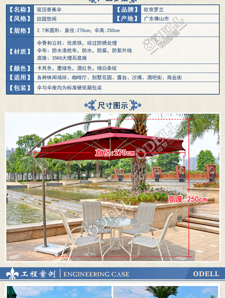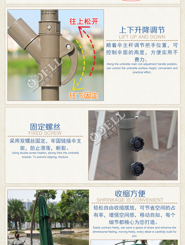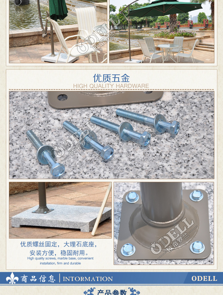 1,部分产品为定制产品,价格标注不一定准确,具体价格根据尺寸数量而定,请咨询客服. 2,铸铝类的产品基本是包邮价,其他产品运费请咨询客服务. 3,我们是工厂直销价,欢迎有实力的中间代理我们的产品。 4,如需要开发票请提供相关的发票资料,增值税专票10个点,普通发票5个点。 5,联系方式:13410230653加V也可以。邮箱:44837780@qq.com 色差问题 售后服务 货物签收 物流说明 家具保养 温馨提示:全国一二三线城市包物流自提,(派送范围内)如需要送货请与客服联系咨询. 佛山百树恒家具有限公司,供应户外遮阳伞、沙滩伞、庭院伞、广告伞、直杆伞、罗马伞、香蕉伞、米兰伞、吊伞,岗亭伞等户外伞产品,可根据客户要求定制,欢迎来电咨询! 【百树恒主营产品】户外铸铝桌椅,实木桌椅,编藤桌椅,沙滩椅躺椅,公园椅长椅,遮阳伞,吊蓝秋千帐篷,户外防腐木花车花箱,售卖车餐车等户外景观产品 【适用范围】户外遮阳伞适用于休闲广场、私家花园、别墅、露天阳台、阳光房、温泉区、茶坐,草坪,酒吧街,商业街,休闲咖啡店、奶茶店,朋友聚会等休闲场所,是您户外休闲、享受生活的理想之选。 厂家可代办理货运,具体运费需根据实际情况咨询物流公司;运费货到目的地后买家再与物流公司结算。运输一般不使用快递,以汽车托运为主,单批数量多的买家可考虑包专车运输,届时我们必将为您洽谈最低的运输费用为您节约成本。 1.现货产品,需全额付款后发货。 2.需定做产品,预付30%定金,完货后付清尾款再发货。 MP:13410230653/13433169155 联系人:何先生 商务QQ:44837780 Email:44837780@qq.com/baishuheng888@sina.com