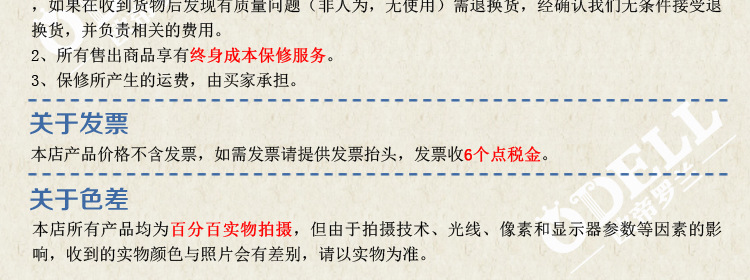 我们产品都是经过我们仔细检查后才包装出货,请买家提货时最好当面验货,为了保障你的权益,签收前请仔细检查,验货时如果发现件数跟物流单上件数不对或者损坏请拒收,并及时联系我们商家沟通解决(尤其是外包装出现磨损或者刮蹭时候,一定要拆箱检查 运输过程中造成的货物损坏如不仔细检查而直接签收,货运公司是拒绝赔偿的,会给您带来不必要的损失)。如买家无理由拒签,产生的全部运输均由买家承担。