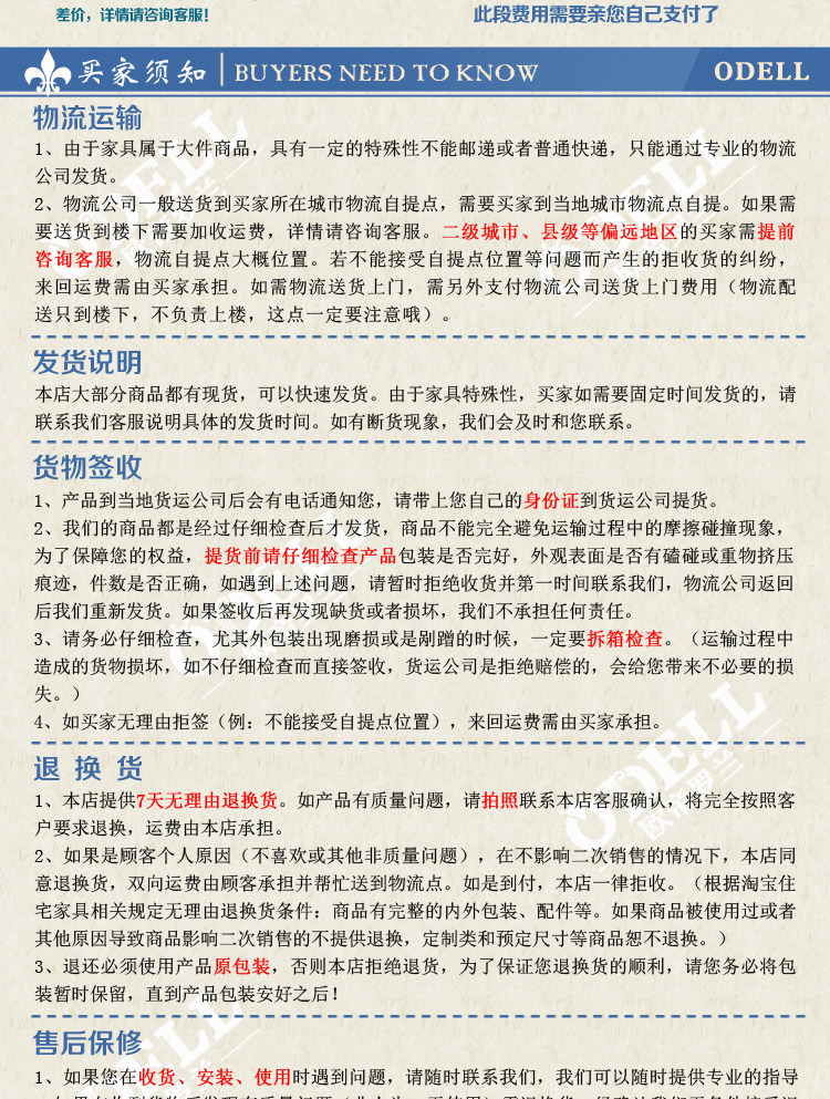 1.发货方式:因家具运输的特殊性,邮寄快递费用昂贵,一般都通过汽运物流公司发货,物流费用请咨询客服是否在包邮范围内。