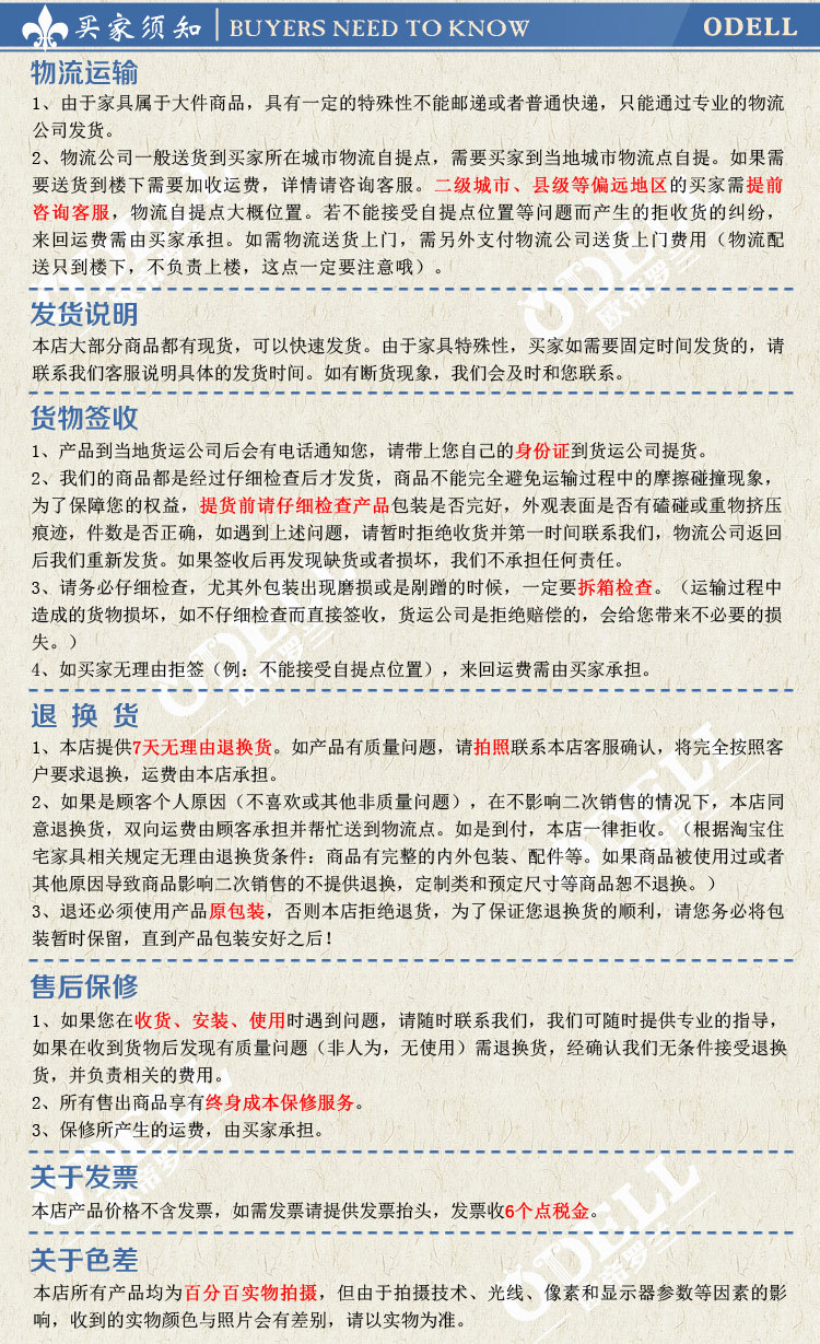 我们产品都是经过我们仔细检查后才包装出货,请买家提货时最好当面验货,为了保障你的权益,签收前请仔细检查,验货时如果发现件数跟物流单上件数不对或者损坏请拒收,并及时联系我们商家沟通解决(尤其是外包装出现磨损或者刮蹭时候,一定要拆箱检查 运输过程中造成的货物损坏如不仔细检查而直接签收,货运公司是拒绝赔偿的,会给您带来不必要的损失)。如买家无理由拒签,产生的全部运输均由买家承担。