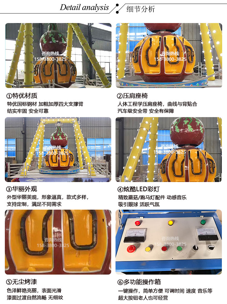公司主要生产机械类游乐设备包括:观缆车类、滑行车类、架空游览类、陀螺类、飞行塔类、转马类、自控飞机类、小火车类、碰碰车类、观光车类等其中包含(神州飞碟、迪斯科转盘、袋鼠跳、旋转咖啡杯、弯月飘车、迷你穿梭、滑行龙、大章鱼、海盗船、摆锤、星际探险、摇滚排排坐、三维太空环、疯狂骑牛机等众多产品)所有生产产品各项指标均达到国家游乐设备行业制定的质量标准。