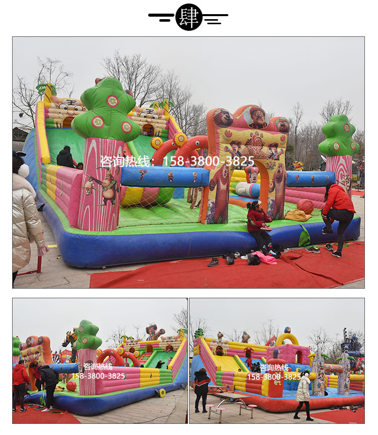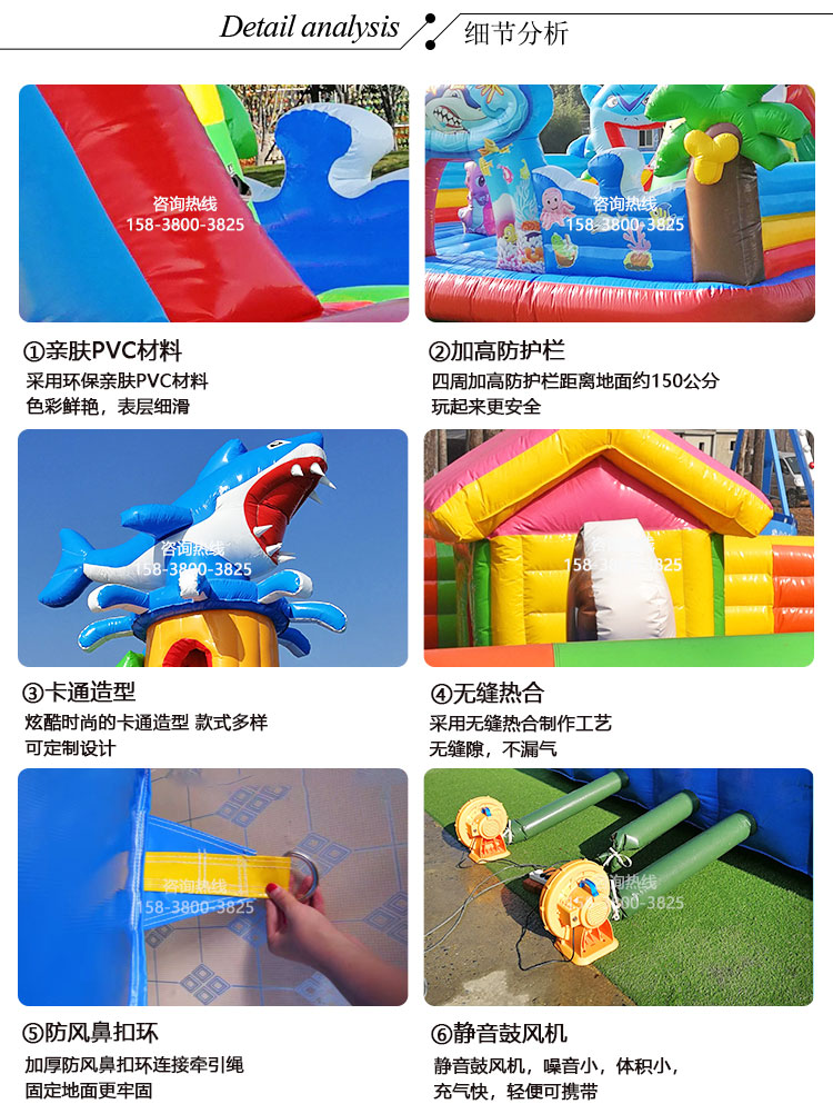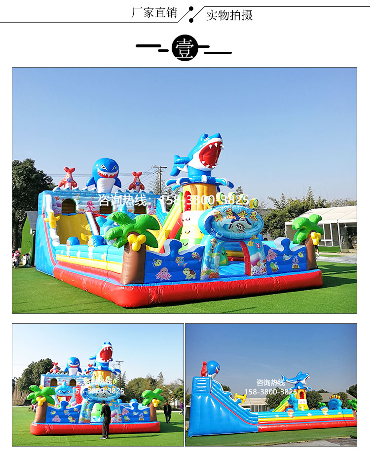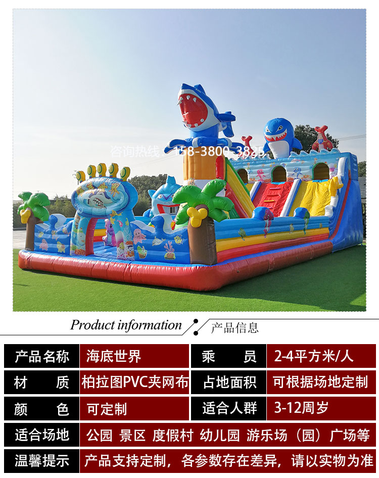 海底世界充气城堡是一种大型的充气类玩具,它是一款专门根据儿童特征设计的游乐设备。通过科学的立体组合形成的一个集游乐、运动、益智、健身等功能为一的新一代儿童游乐园。针对儿童喜好钻、爬、滑、滚、晃、荡、跳、摇等天性设计的。其色彩搭配丰富,色泽亮丽,给人以视觉冲击力,卡通造型更加吸引孩子的目光。常规有猪猪侠,闯关城堡,熊出没城堡,夺宝雄兵大滑梯以及鲨鱼滑梯城堡等等,可以根据客户要求造型定制。
