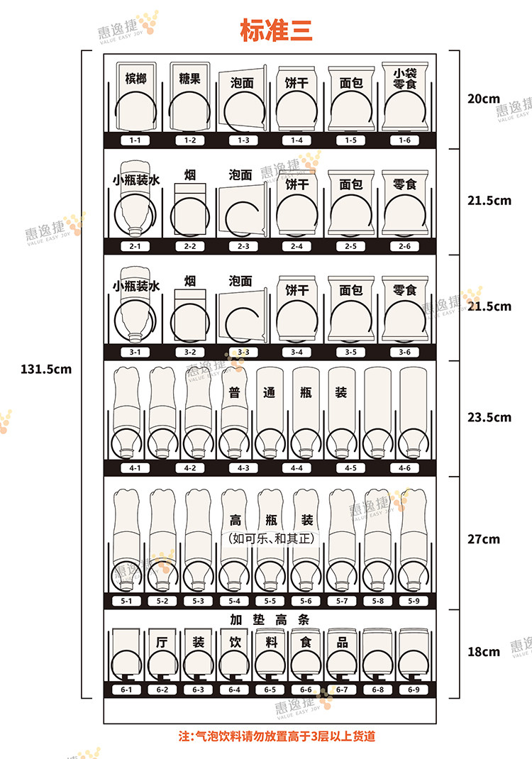 容量规格:6层货道,每层可放9种商品,可销售54种商品
