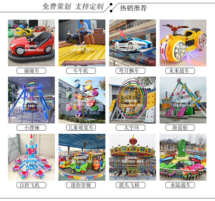 公司主要生产机械类游乐设备包括:观缆车类、滑行车类、架空游览类、陀螺类、飞行塔类、转马类、自控飞机类、小火车类、碰碰车类、观光车类等其中包含(神州飞碟、迪斯科转盘、袋鼠跳、旋转咖啡杯、弯月飘车、迷你穿梭、滑行龙、大章鱼、海盗船、摆锤、星际探险、摇滚排排坐、三维太空环、疯狂骑牛机等众多产品)所有生产产品各项指标均达到国家游乐设备行业制定的质量标准。