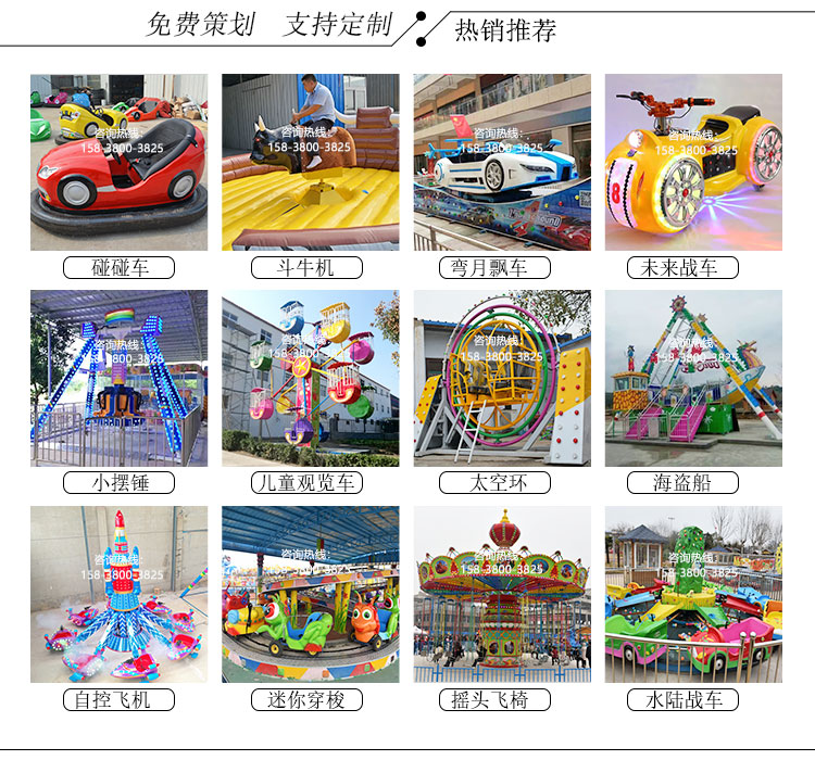 公司主要生产机械类游乐设备包括:观缆车类、滑行车类、架空游览类、陀螺类、飞行塔类、转马类、自控飞机类、小火车类、碰碰车类、观光车类等其中包含(神州飞碟、迪斯科转盘、袋鼠跳、旋转咖啡杯、弯月飘车、迷你穿梭、滑行龙、大章鱼、海盗船、摆锤、星际探险、摇滚排排坐、三维太空环、疯狂骑牛机等众多产品)所有生产产品各项指标均达到国家游乐设备行业制定的质量标准。