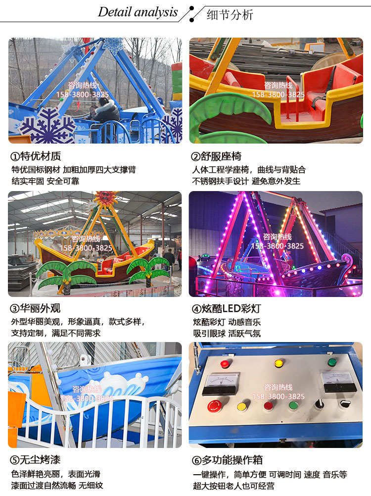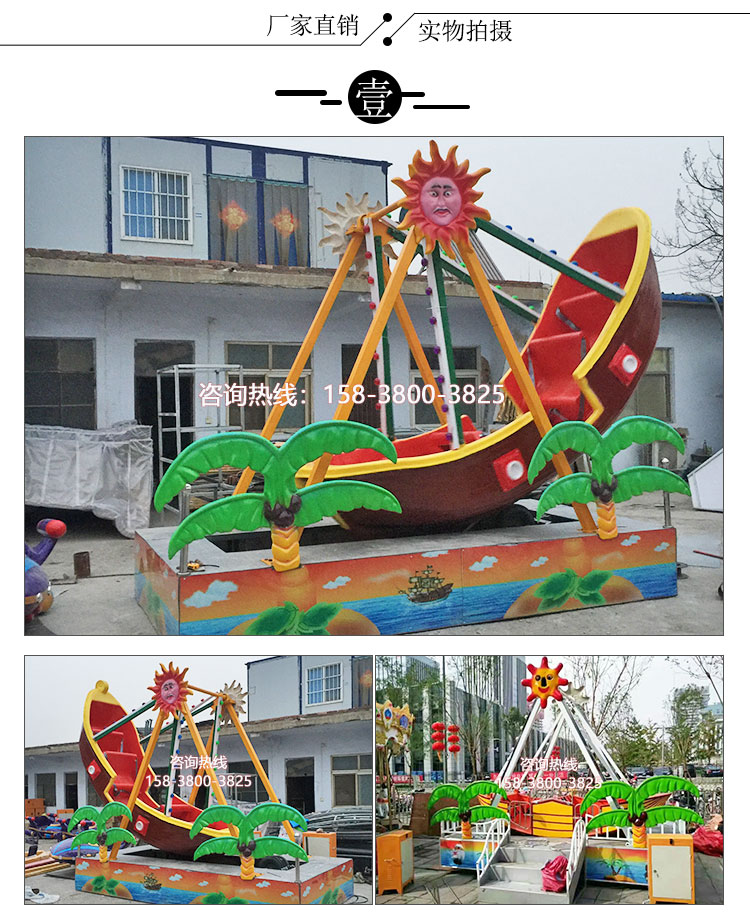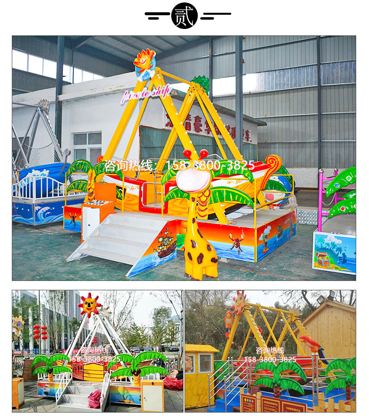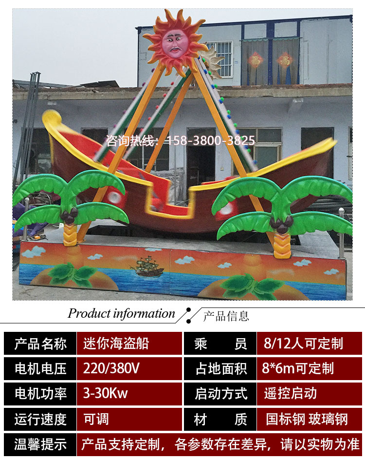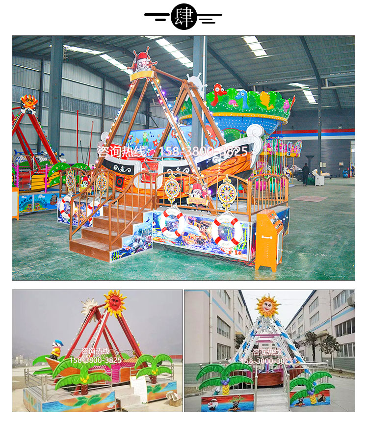 迷你海盗船是儿童游乐设备的另一种存在方式,它除了继承大型海盗船的惊险刺激,又添加了迷你海盗船的小巧精致,设计师考虑到了船的往返特性,采用摆动的形式,配有炫酷的灯光,动感的音乐,持久不褪色的喷漆绘画以及其他高精密电器元件,另外考虑到儿童的兴趣和心理,外形上配有卡通植物或人物,鲜艳的颜色,可爱的卡通,且款式多样,满足不同需求,非常受小朋友的喜欢。