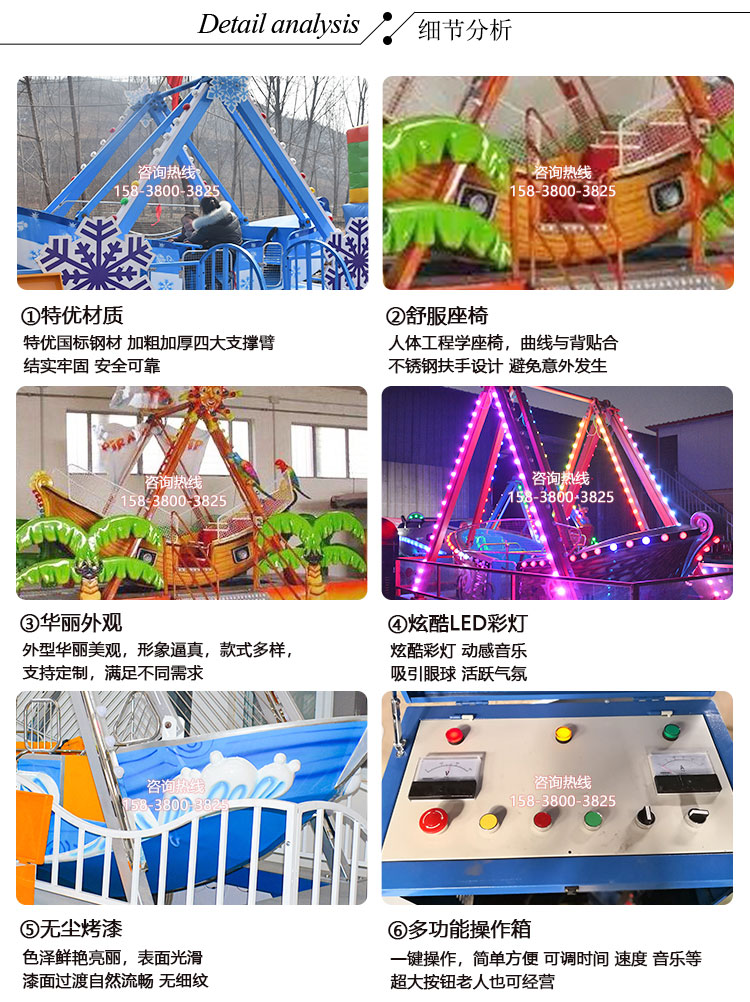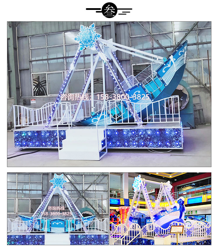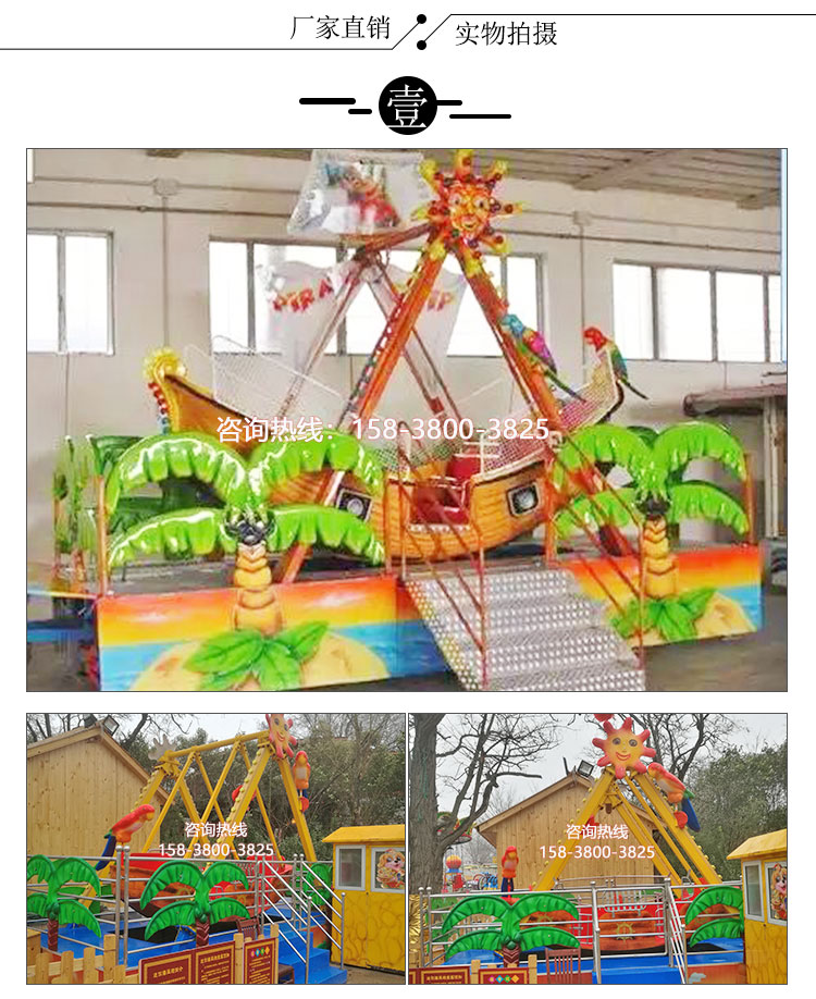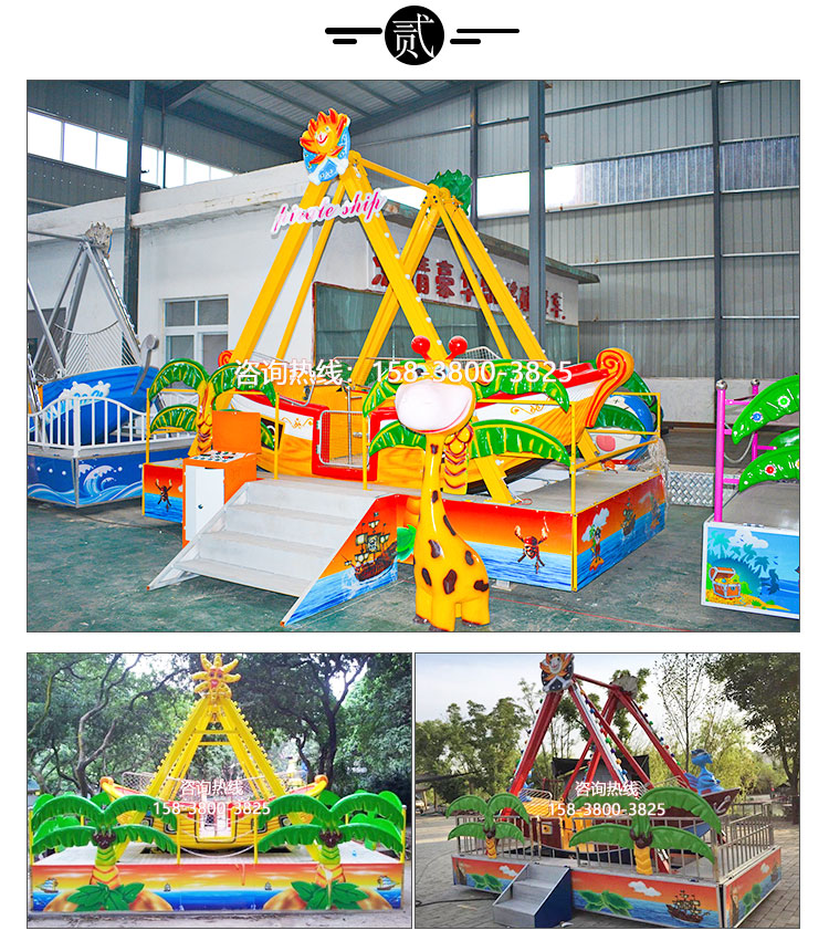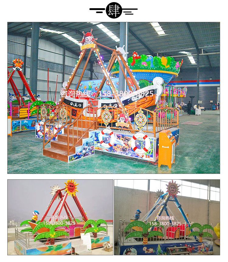 迷你海盗船是儿童游乐设备的另一种存在方式,它除了继承大型海盗船的惊险刺激,又添加了迷你海盗船的小巧精致,设计师考虑到了船的往返特性,采用摆动的形式,配有炫酷的灯光,动感的音乐,持久不褪色的喷漆绘画以及其他高精密电器元件,另外考虑到儿童的兴趣和心理,外形上配有卡通植物或人物,鲜艳的颜色,可爱的卡通,且款式多样,满足不同需求,非常受小朋友的喜欢。