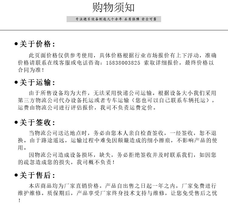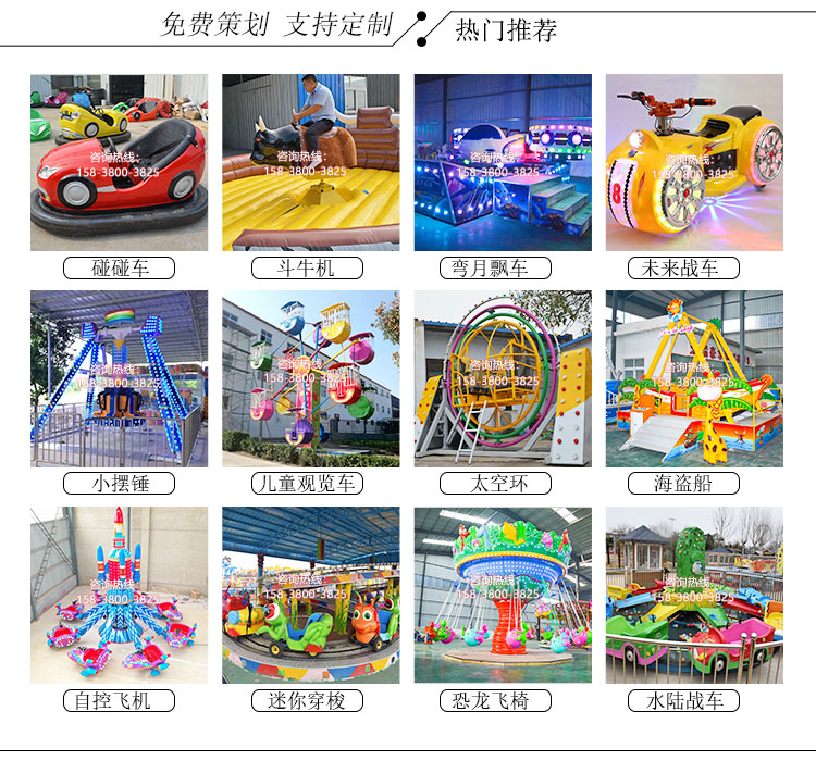 公司主要生产机械类游乐设备包括:观缆车类、滑行车类、架空游览类、陀螺类、飞行塔类、转马类、自控飞机类、小火车类、碰碰车类、观光车类等其中包含(神州飞碟、迪斯科转盘、袋鼠跳、旋转咖啡杯、弯月飘车、迷你穿梭、滑行龙、大章鱼、海盗船、摆锤、星际探险、摇滚排排坐、三维太空环、疯狂骑牛机等众多产品)所有生产产品各项指标均达到国家游乐设备行业制定的质量标准。