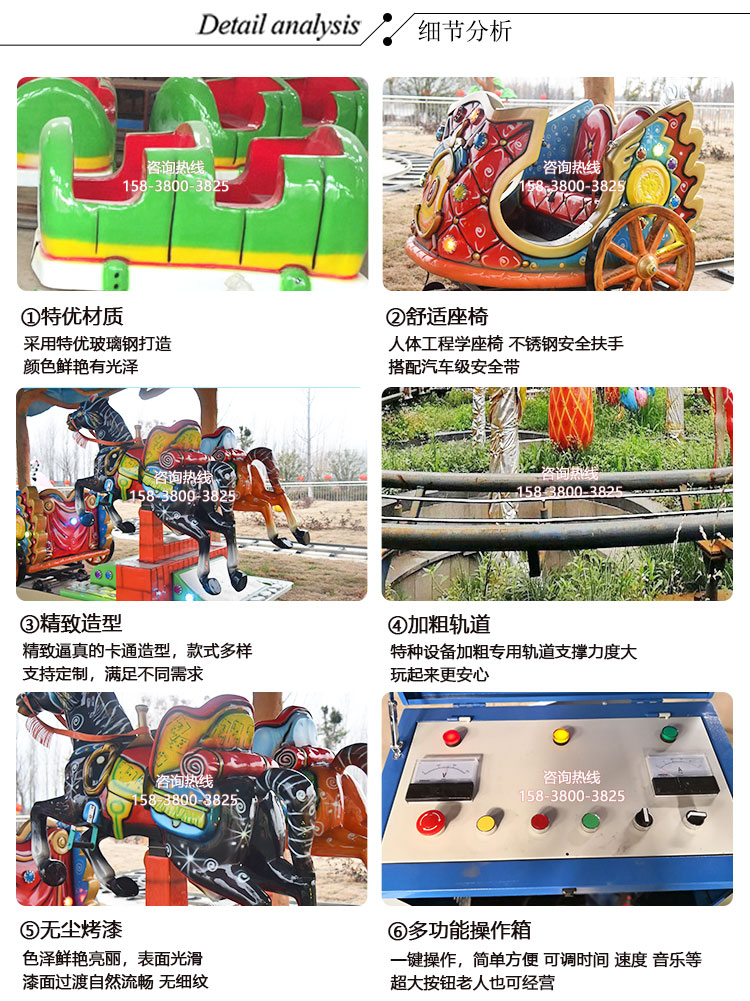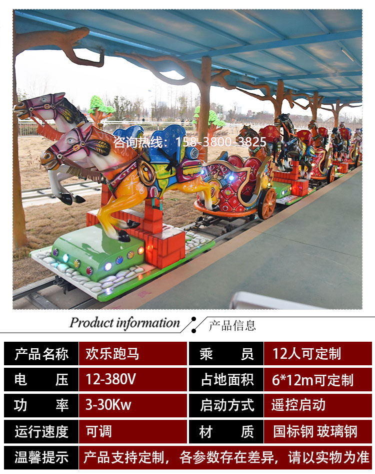 欢乐跑马又叫轨道跑马,它是一种形似万马奔腾场景的游乐设备,它一般由4组小马组合,一组2匹小马。设备下面铺设有预设好的轨道,小马在轨道上奔驰。小马跑动时,会一上一下起伏,伴着逼真的马叫嘶鸣声,仿佛在驾马奔腾一样!正是因为这样的形象逼真,很受大朋友小朋友喜爱!